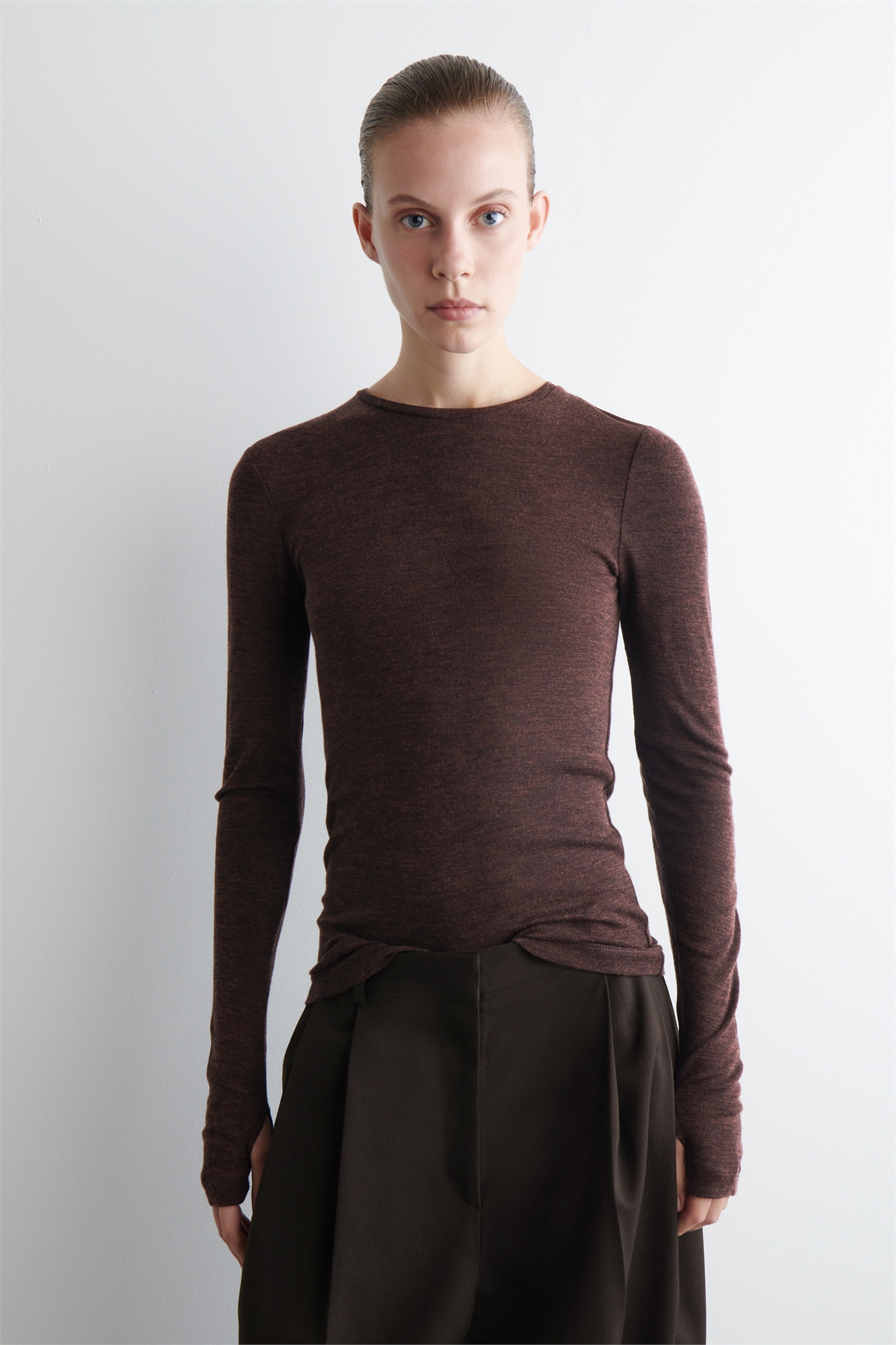 Этот топ с длинными рукавами - изысканный элемент гардероба - выполнен тонкой вязкой из первоклассной мериносовой шерсти, выбранной за ее естественную легкость и непревзойденную мягкость. Он украшен манжетами с отверстиями для больших пальцев и имеет тонкий силуэт, который позволяет носить его многослойно. Узкий кройЭто изделие содержит шерстяное волокно Responsible Wool Standard TE-00047206 (RWS) с ферм, сертифицированных в соответствии с требованиями к благополучию животных и землепользованию Материал: 100% мериносовая шерсть. Без учета отделки / Машинная стирка Длина по спинке для размера S составляет 61 см / Модель носит размер S