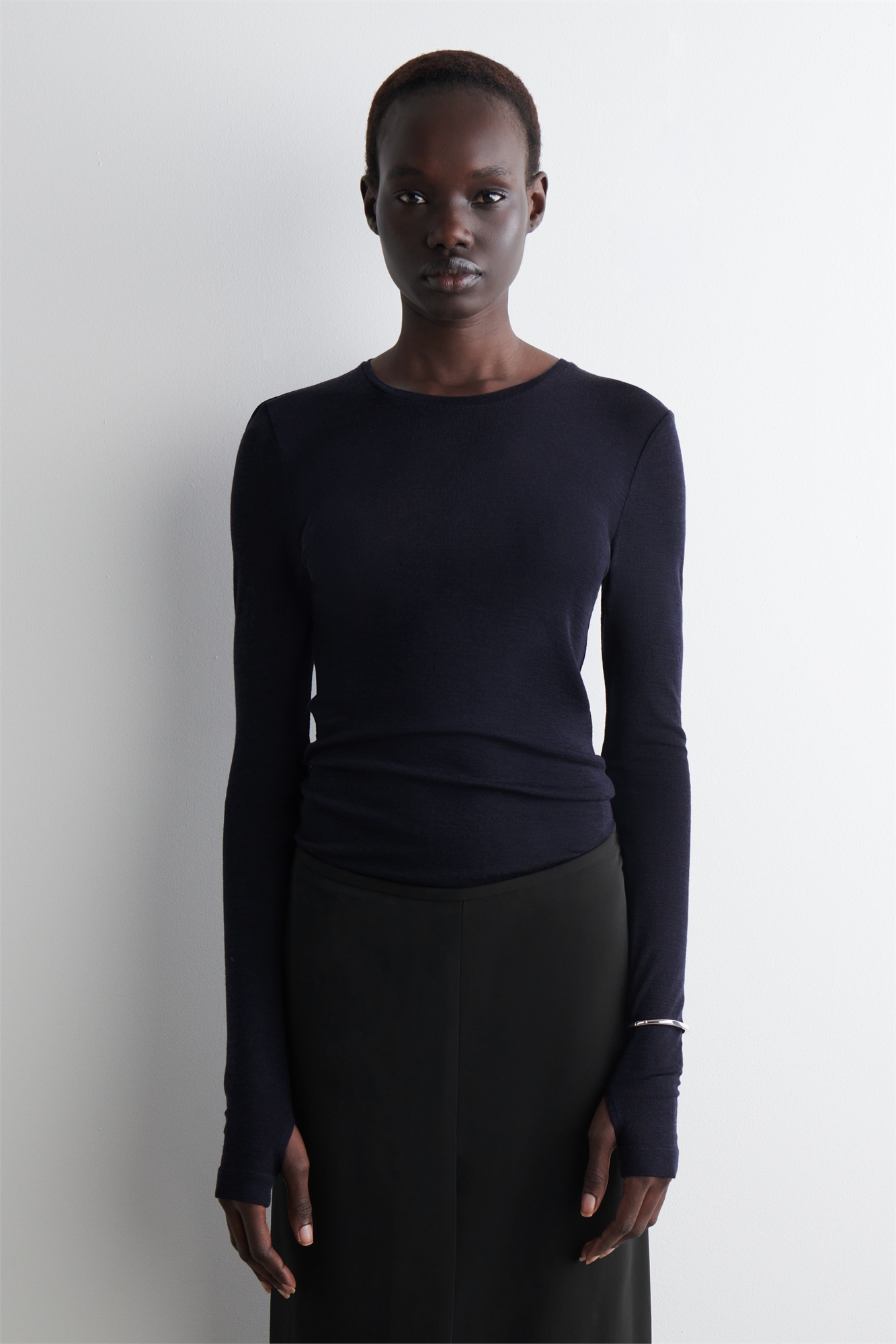 Этот топ с длинными рукавами - изысканный элемент гардероба - выполнен тонкой вязкой из первоклассной мериносовой шерсти, выбранной за ее естественную легкость и непревзойденную мягкость. Он украшен манжетами с отверстиями для больших пальцев и имеет тонкий силуэт, который позволяет носить его многослойно. Узкий кройЭто изделие содержит шерстяное волокно Responsible Wool Standard TE-00047206 (RWS) с ферм, сертифицированных в соответствии с требованиями к благополучию животных и землепользованию Материал: 100% мериносовая шерсть. Без учета отделки / Машинная стирка Длина по спинке для размера S составляет 61 см / Модель носит размер S
