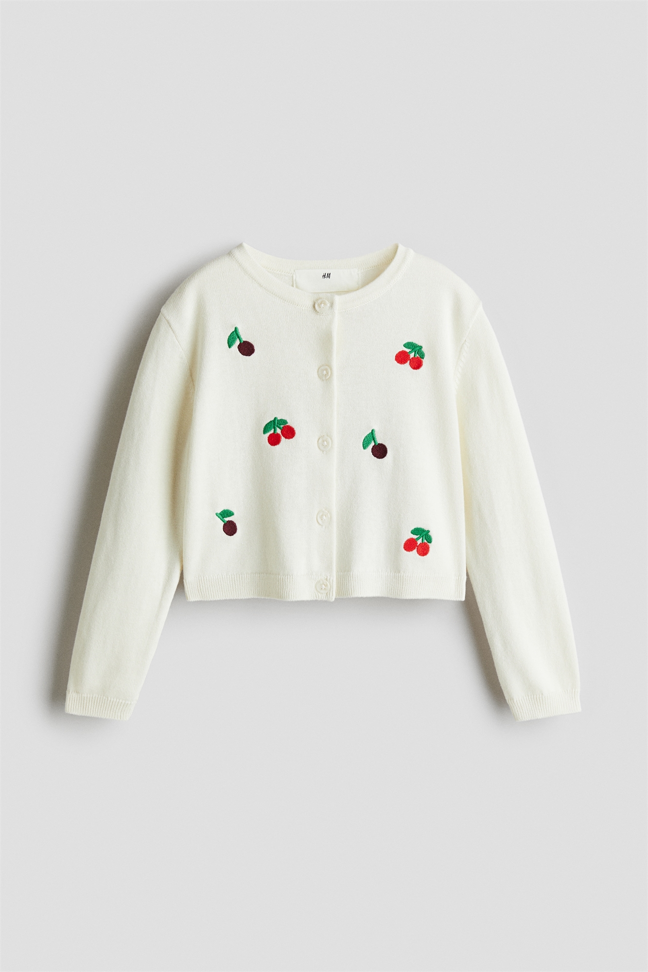 Кардиган из мягкого хлопка тонкой вязки с вышитыми мотивами. Круглый вырез, застежка на пуговицы спереди и тесемки на манжетах и подоле.
