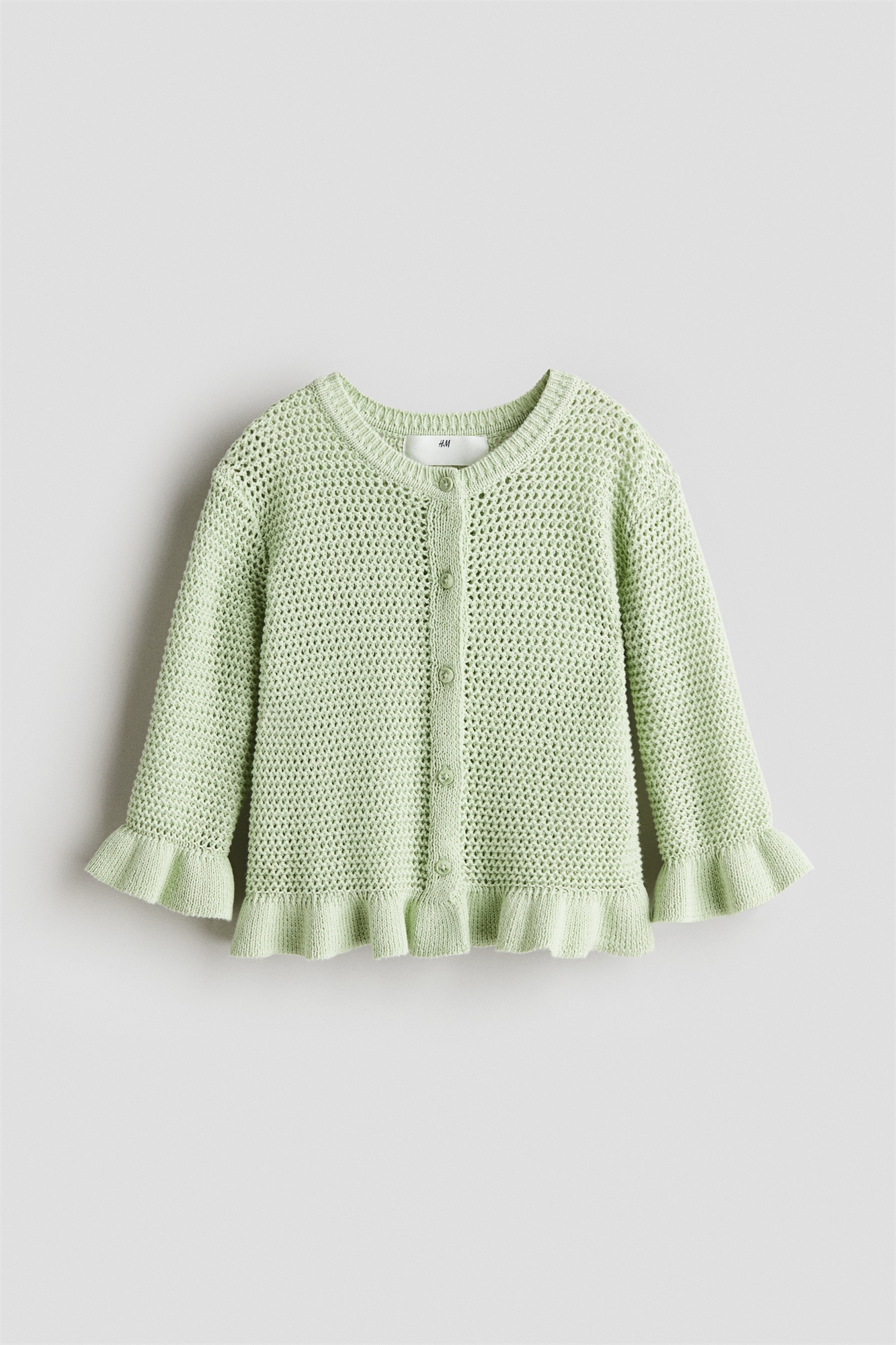 Кардиган из мягкого вязаного трикотажа с круглым вырезом с ребристой отделкой и пуговицами спереди. Рукава длиной 3/4 с манжетами с оборкой и оборкой по подолу.