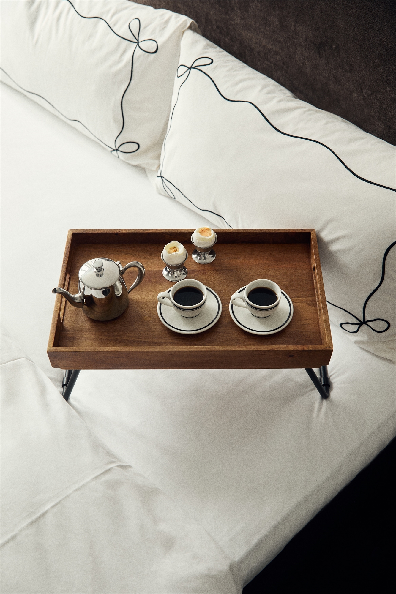 Прямоугольный поднос для кровати из дерева манго с ручкой с каждой стороны и складными металлическими ножками.
