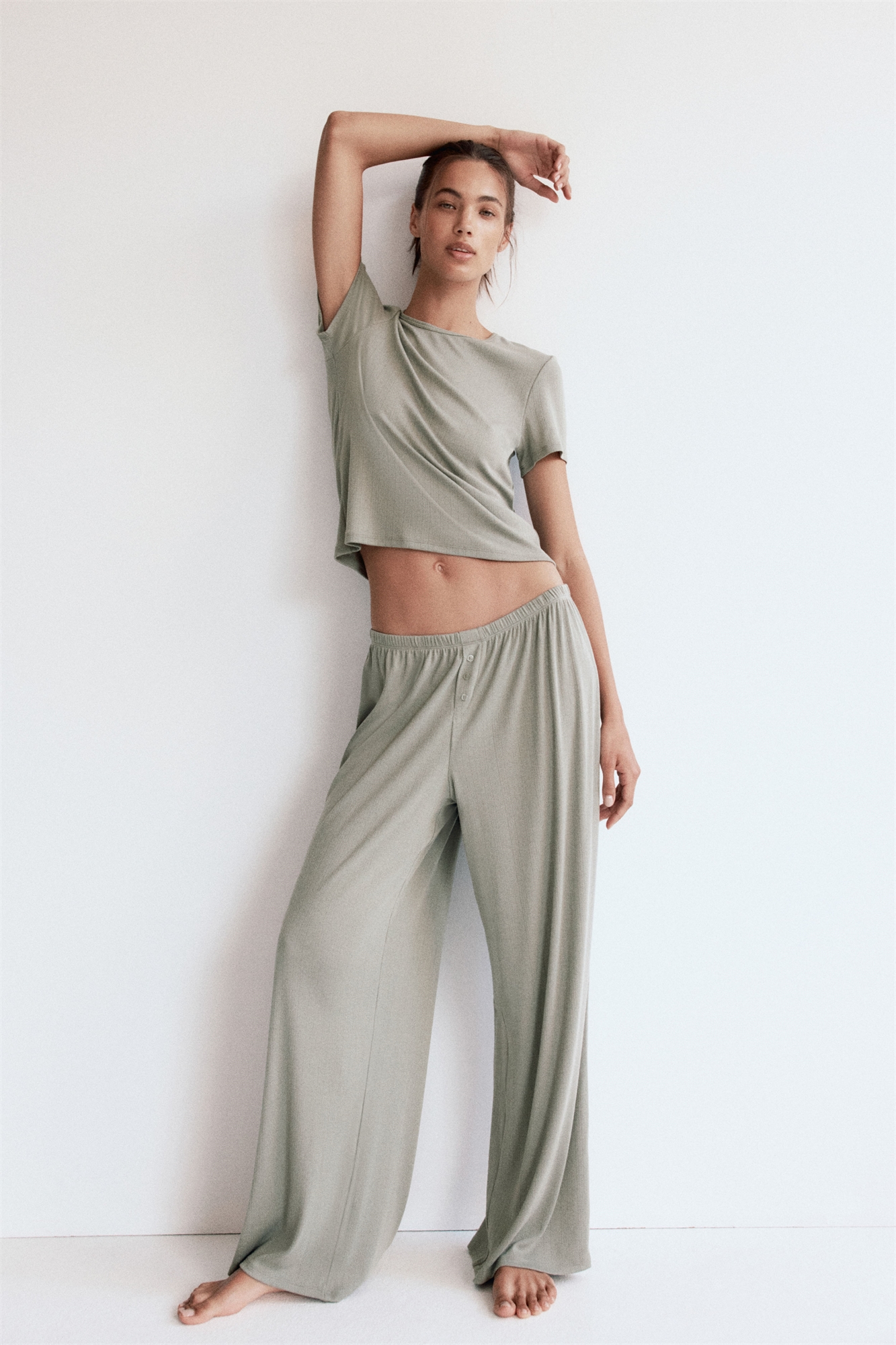 Пижама с футболкой и нижней частью из мягкого трикотажа пуантель. Футболка с круглым вырезом и узкой окантовкой. Низ с эластичной талией, фальшивой ширинкой с видимыми пуговицами и широкими штанинами.