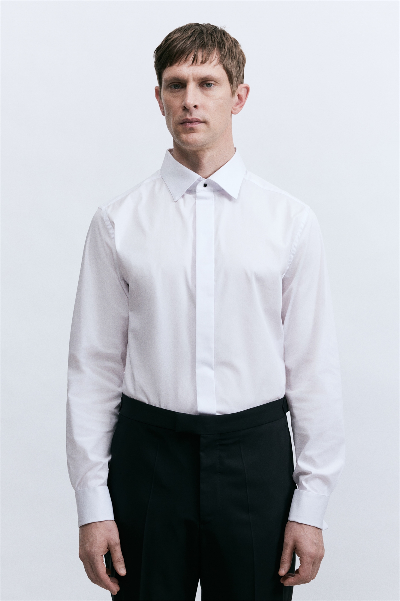 Рубашка-смокинг из тканого хлопкового микса с отложным воротником и верхней пуговицей, скрытой пуговицей и передом. Длинные рукава с манжетами на пуговицах и рукавной планкой с пуговицей. Закругленный подол. Зауженный крой, облегающий контуры тела и создающий приталенный силуэт.