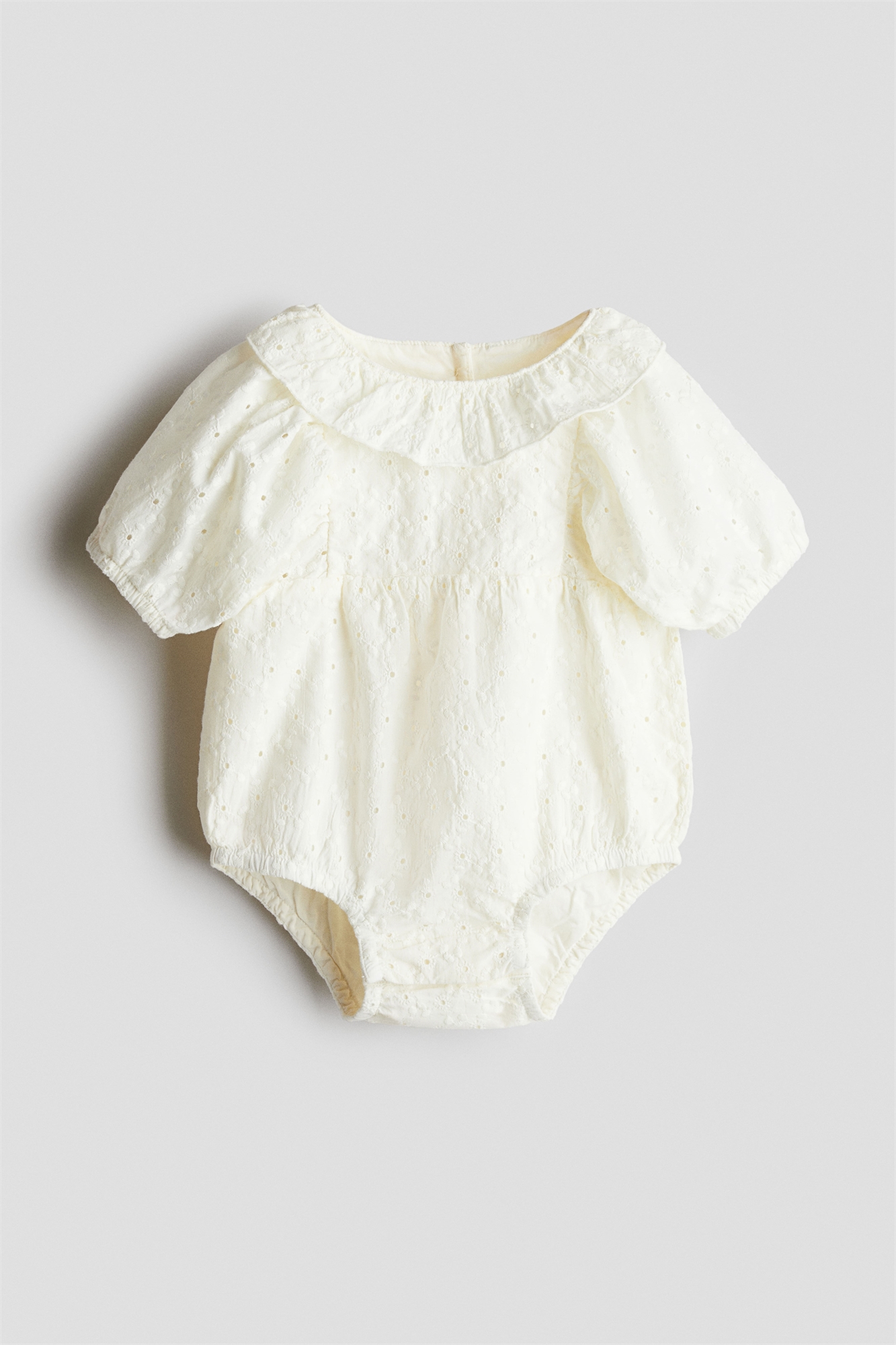 Костюм ромпер из мягкого хлопкового поплина с рисунком broderie anglaise. Закругленный воротник и застежка на пуговицы сзади. Узкий покрой, короткие пышные рукава и застежки внизу для удобства переодевания. Узкая эластичная резинка на манжетах и по ногам. На подкладке.