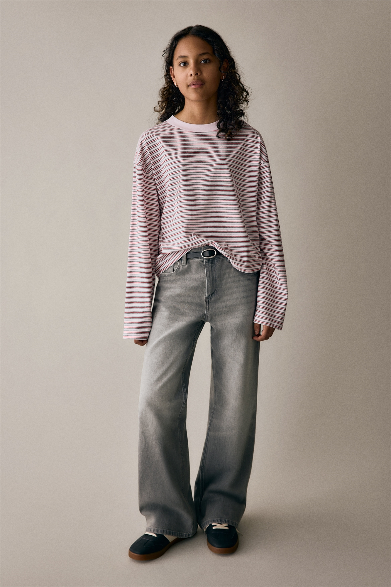 Джинсы с 5 карманами из моющегося денима. Мешковатая посадка по бедрам и ляжкам, опущенная промежность и расклешенные ноги. Заниженная талия с регулируемой резинкой для идеальной посадки, ширинка на молнии и пуговице.