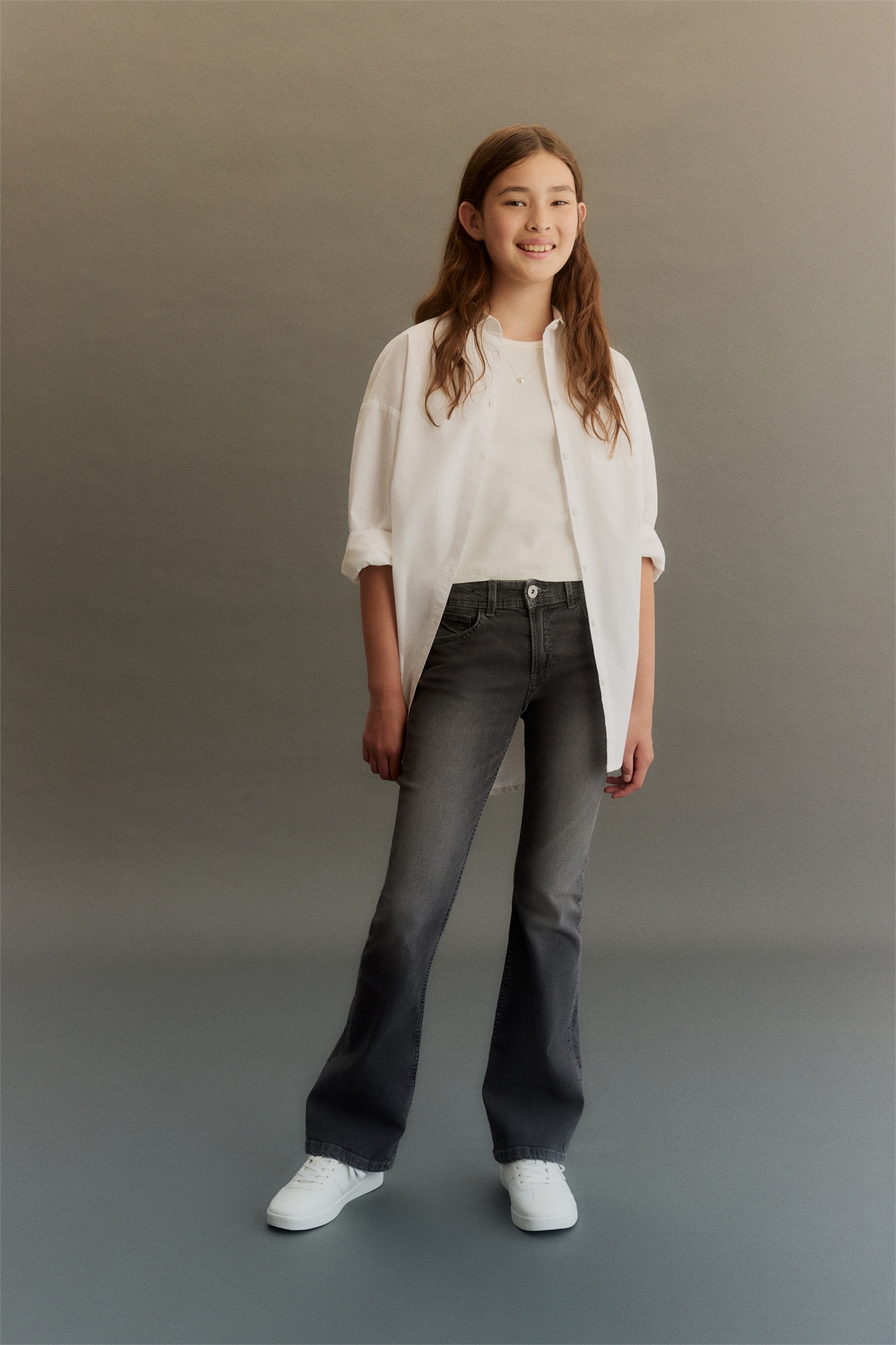 Джинсы из эластичного денима с зауженной посадкой по бедрам и ляжкам и расклешенными ногами. Заниженная талия с регулируемой резинкой и ширинка на молнии с пуговицей. Передние и задние карманы.