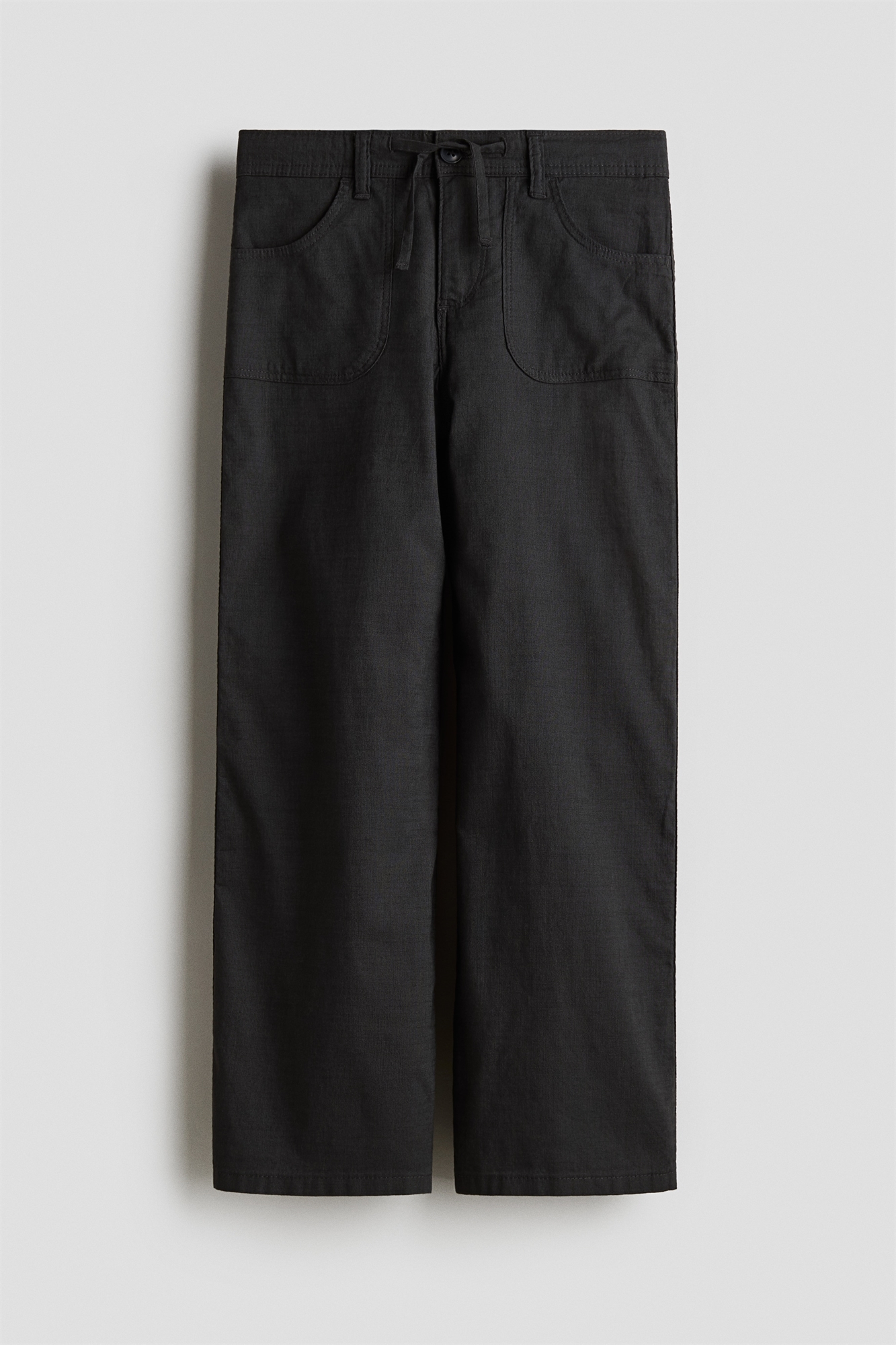 Брюки из мягкого, воздушного хлопкового полотна со свободным кроем в области бедер и ляжек и широкими штанинами. Заниженная талия с утягивающим шнурком, ширинка на молнии и пуговице, накладные карманы спереди и сзади.