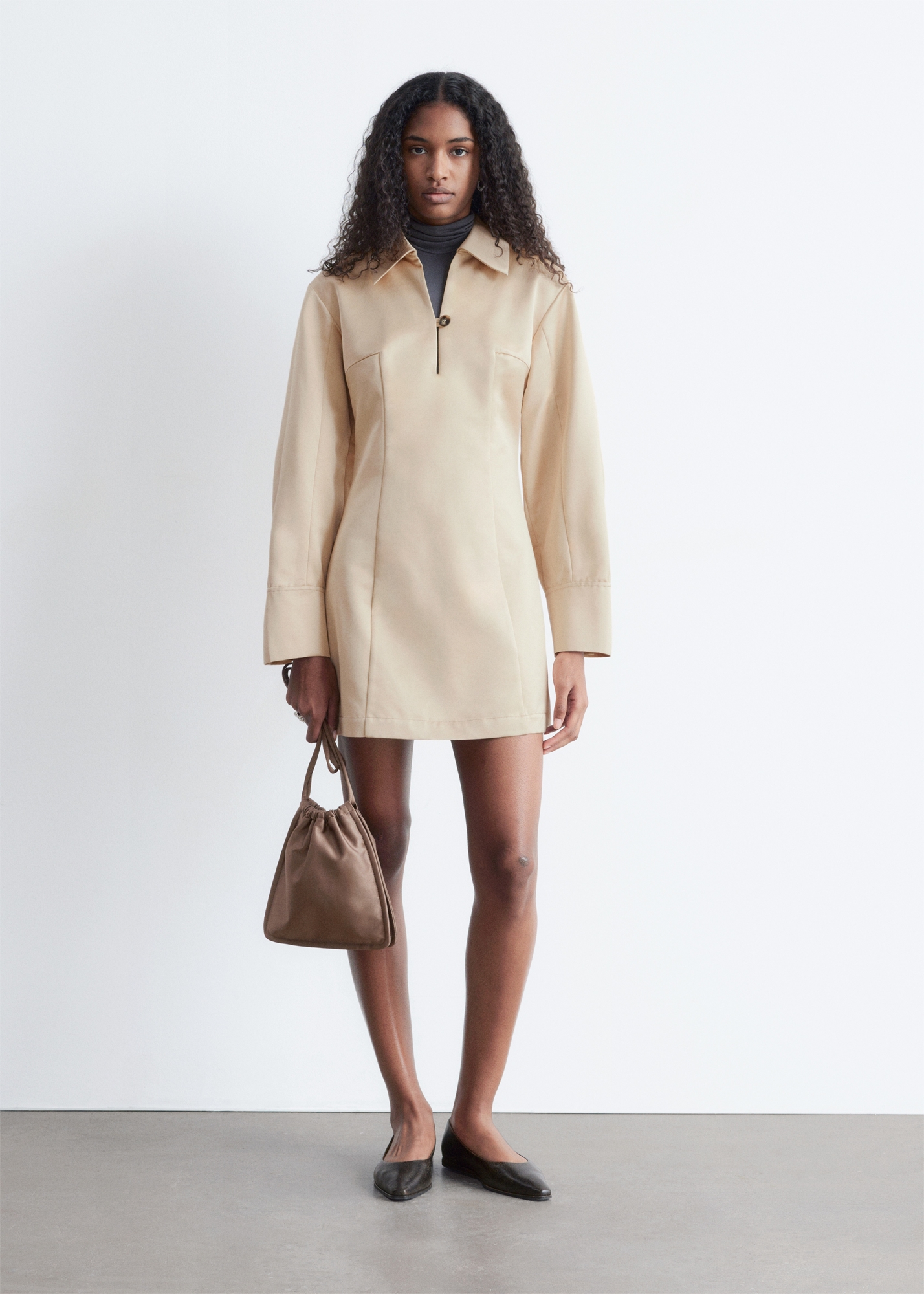 Это мини-платье-блейзер сшито из легкого саржевого атласа и имеет скульптурный силуэт с приталенной талией. Оно имеет отрезные швы, открытый воротник с V-образным вырезом, застегивающимся на пуговицу, и длинные рукава с манжетами на пуговицах. Застежка на потайную молнию сбоку. Длина платья: 107,6 см / 42,4 дюйма (EU 36 / UK 8 / US 4)