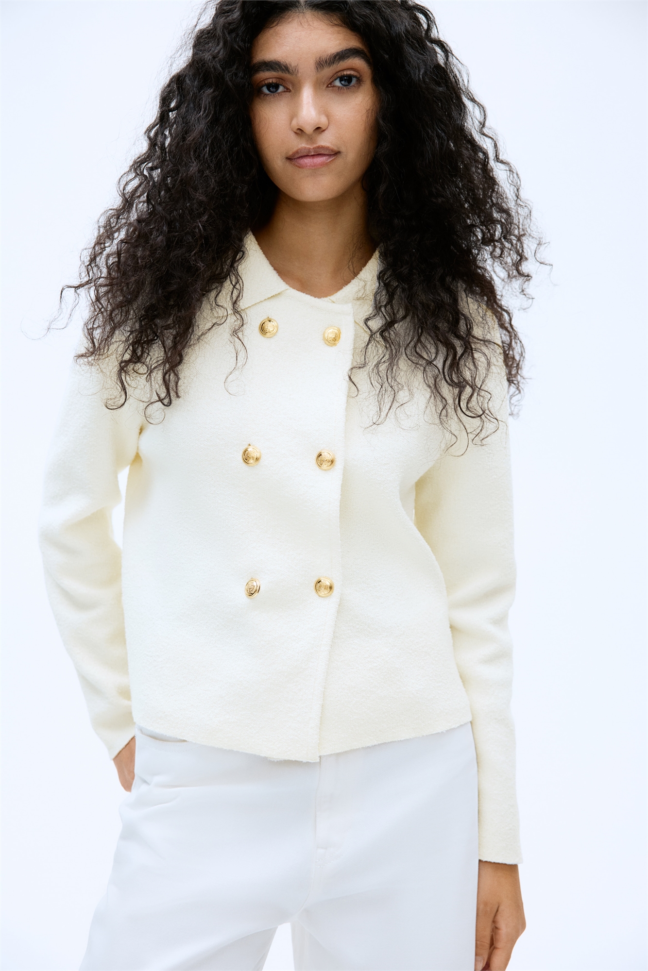 Кардиган из хлопкового микса тонкой вязки с воротником и двубортным передом с металлическими пуговицами с узором.