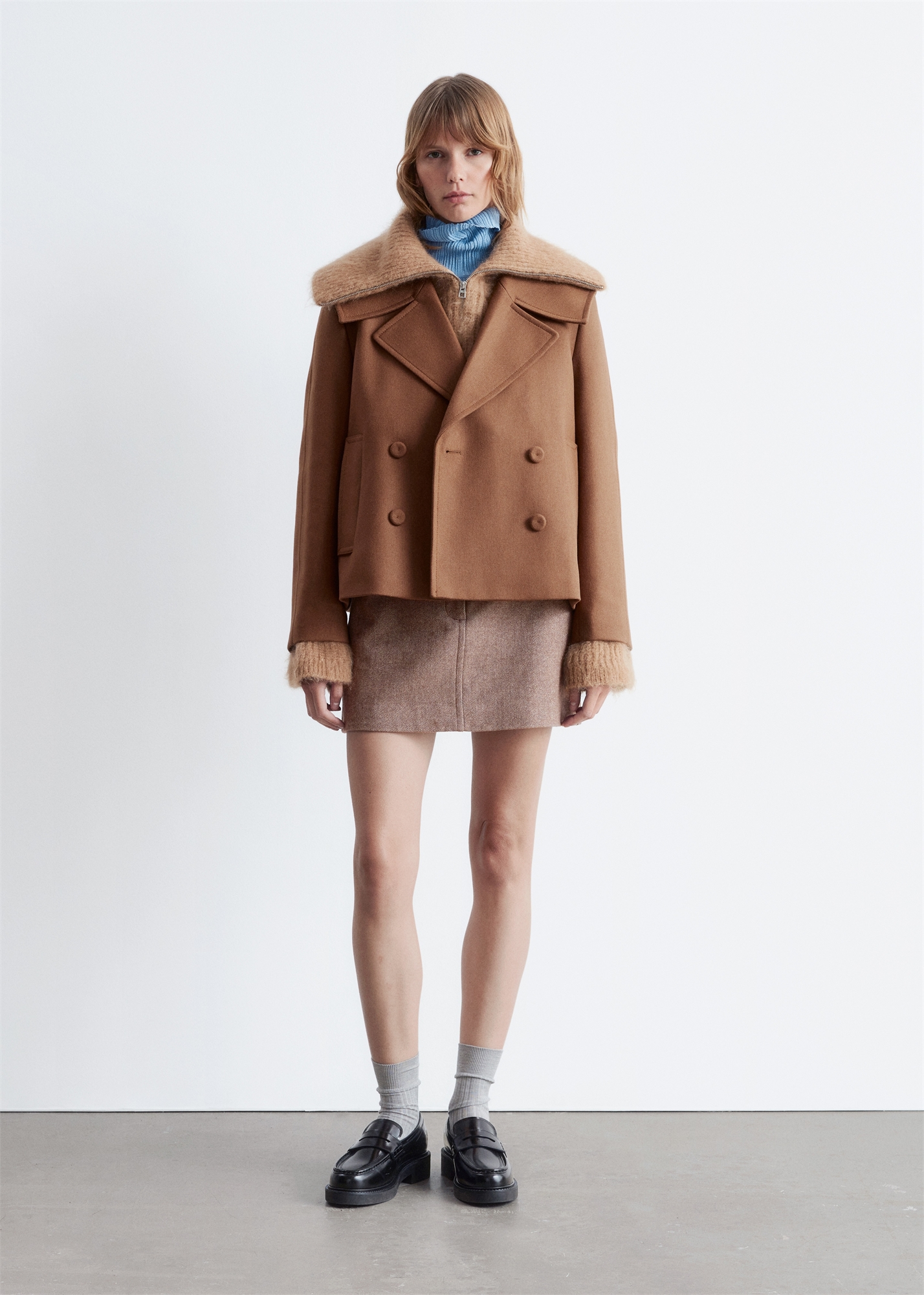 Этот двубортный пиджак сшит из шерстяной смеси и имеет силуэт горохового пальто А-линии. Лацкан с вырезом, квадратный воротник в матросском стиле сзади, два больших накладных кармана и складка на подоле сзади. Полностью на подкладке Длина пиджака: 63 см / 24,8” (размер S)