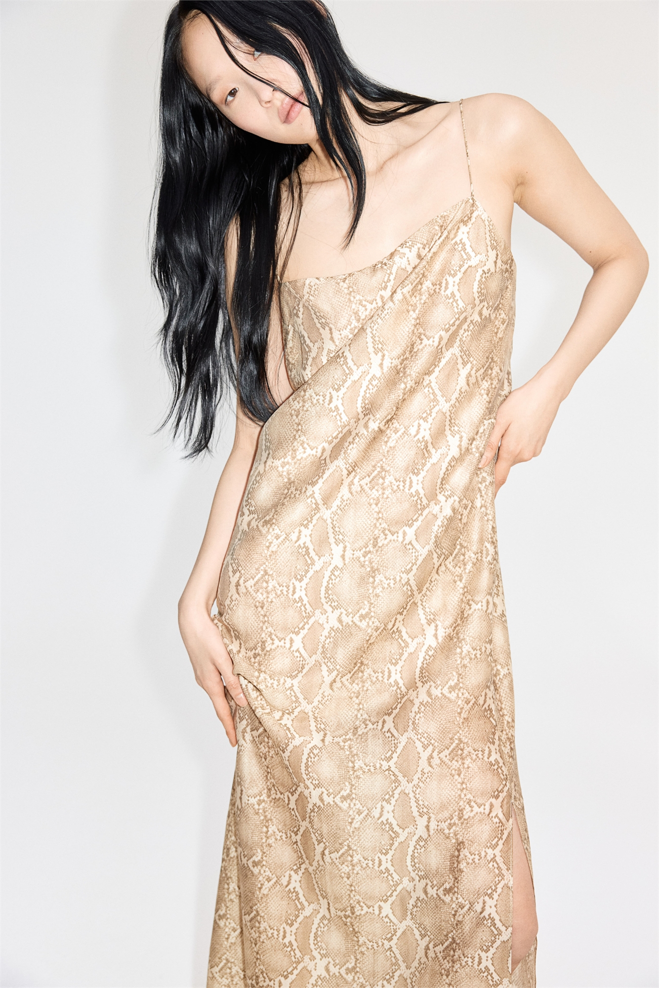 Приталенное платье длиной до колен из тканого материала, изготовленного из смеси лиоцелла. Бретели-спагетти, прямой вырез, нагрудные вытачки и подол прямого кроя с высоким разрезом с одной стороны. Частично на подкладке.