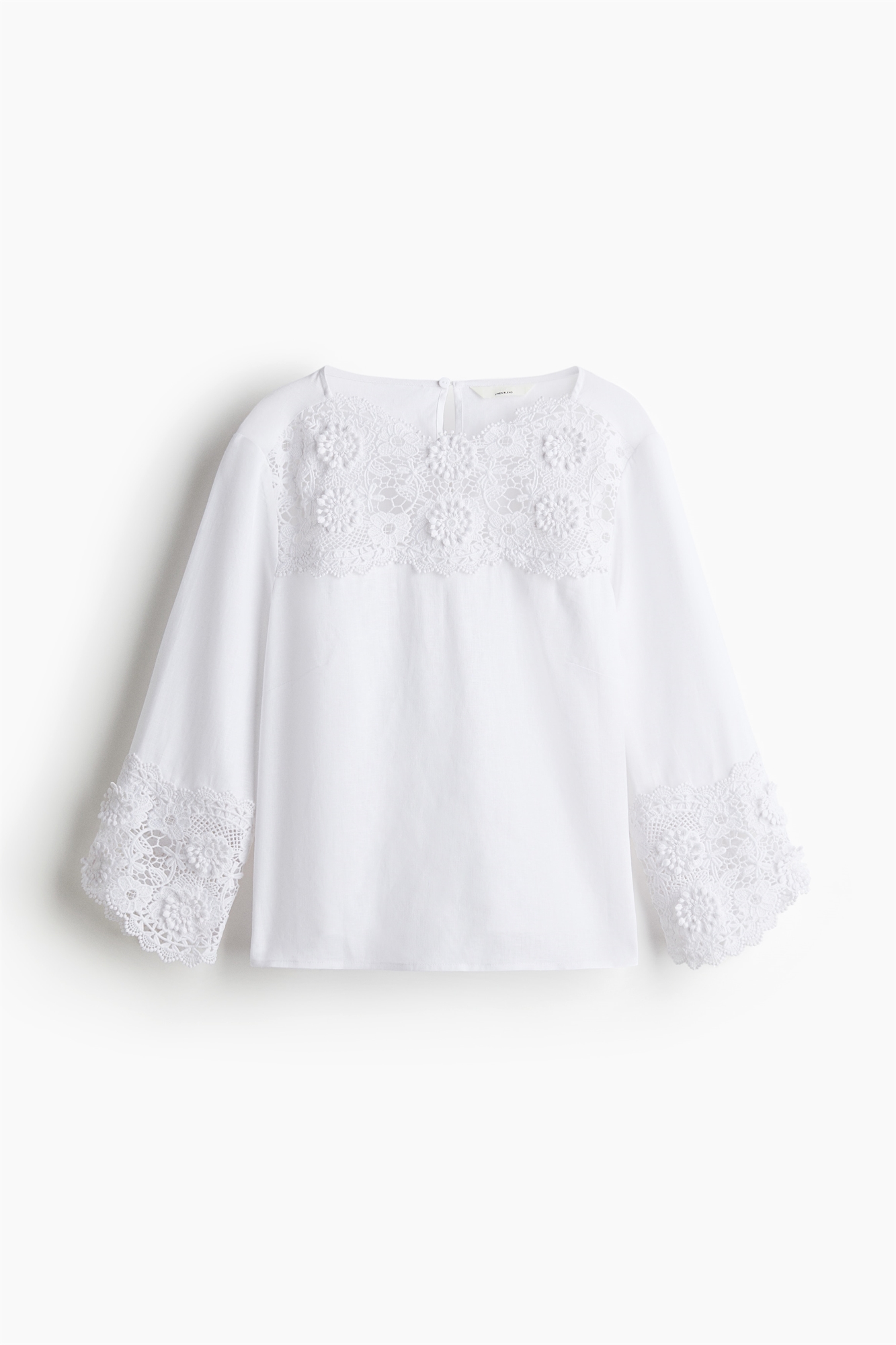Блузка из льна и вискозы с вышивкой на переднем ярде и манжетах. Круглый вырез с прорезью для ключа и потайной пуговицей сзади. Рукава длиной 3/4 и прямой подол.