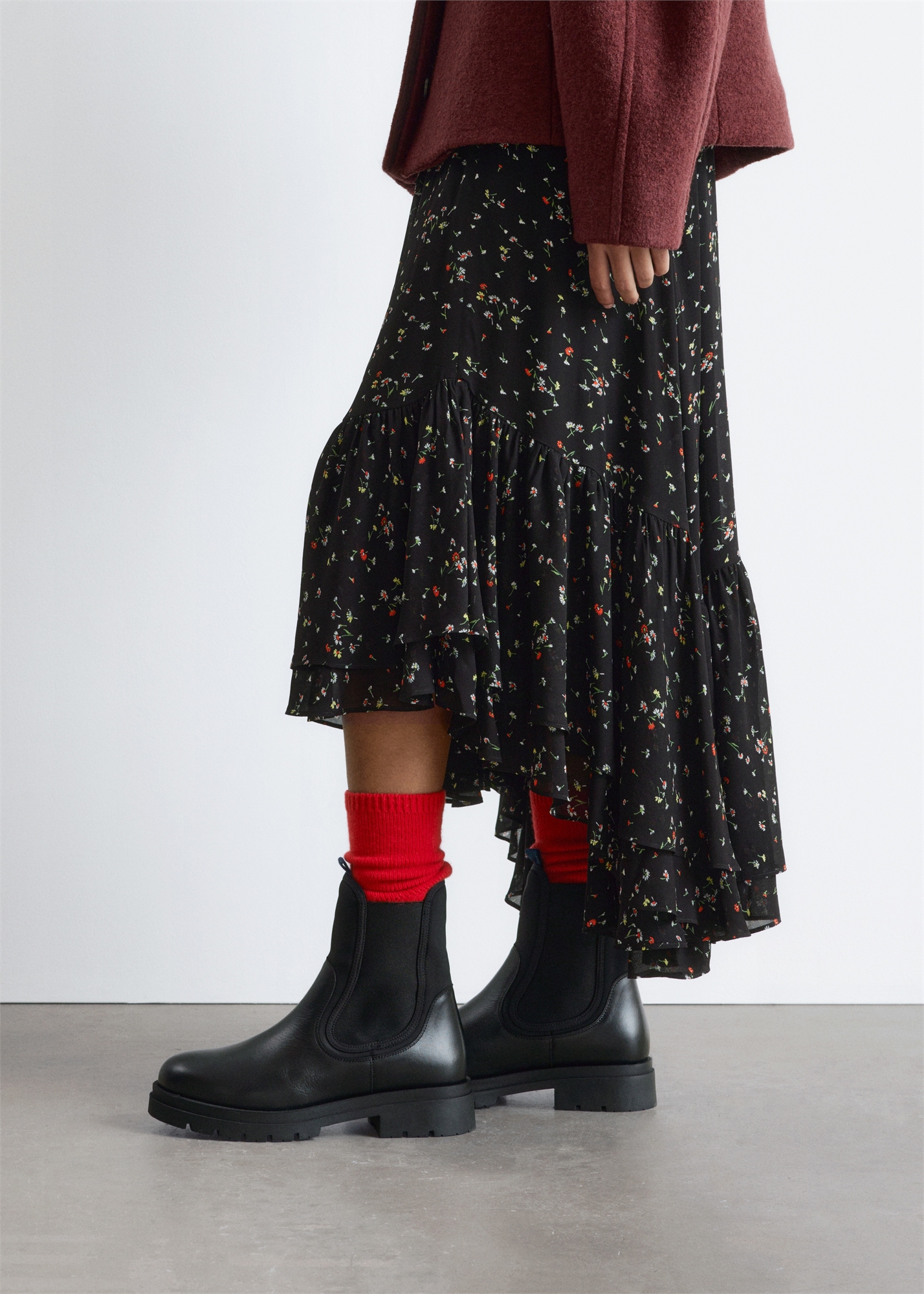 Эти ботинки челси, изготовленные в Португалии из мягкой кожи, имеют эластичные боковые голенища и голенище из мягкого материала, обеспечивающего удобную посадку и позволяющего легко натягивать их с помощью боковых язычков. Они обуты на толстую узорчатую подошву.