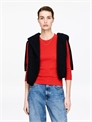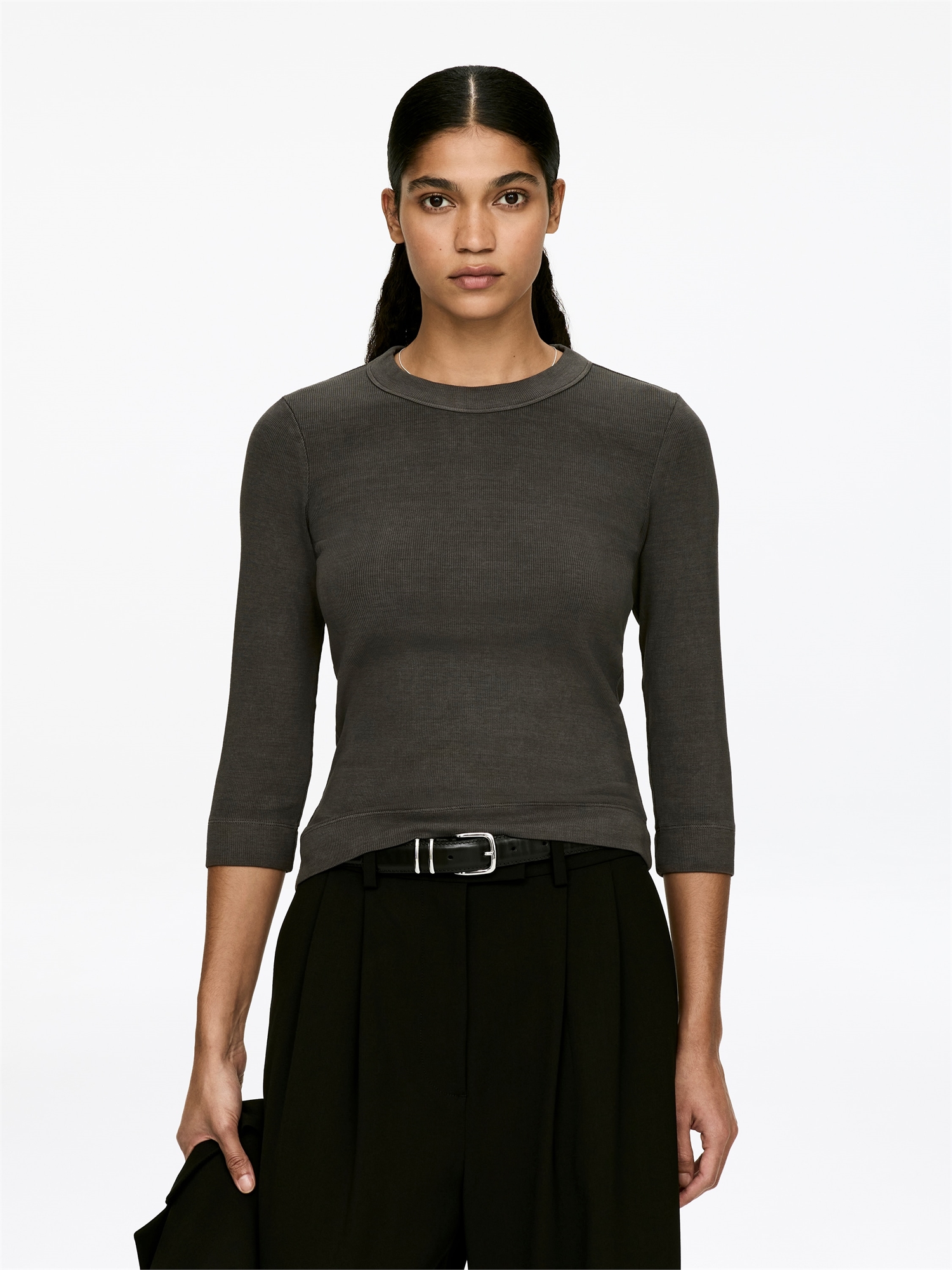 Топ с круглым вырезом из ребристого хлопкового джерси с намеком на растяжение. Рукава длиной три четверти и завязка 3,5 см у горловины. Облегающий крой.