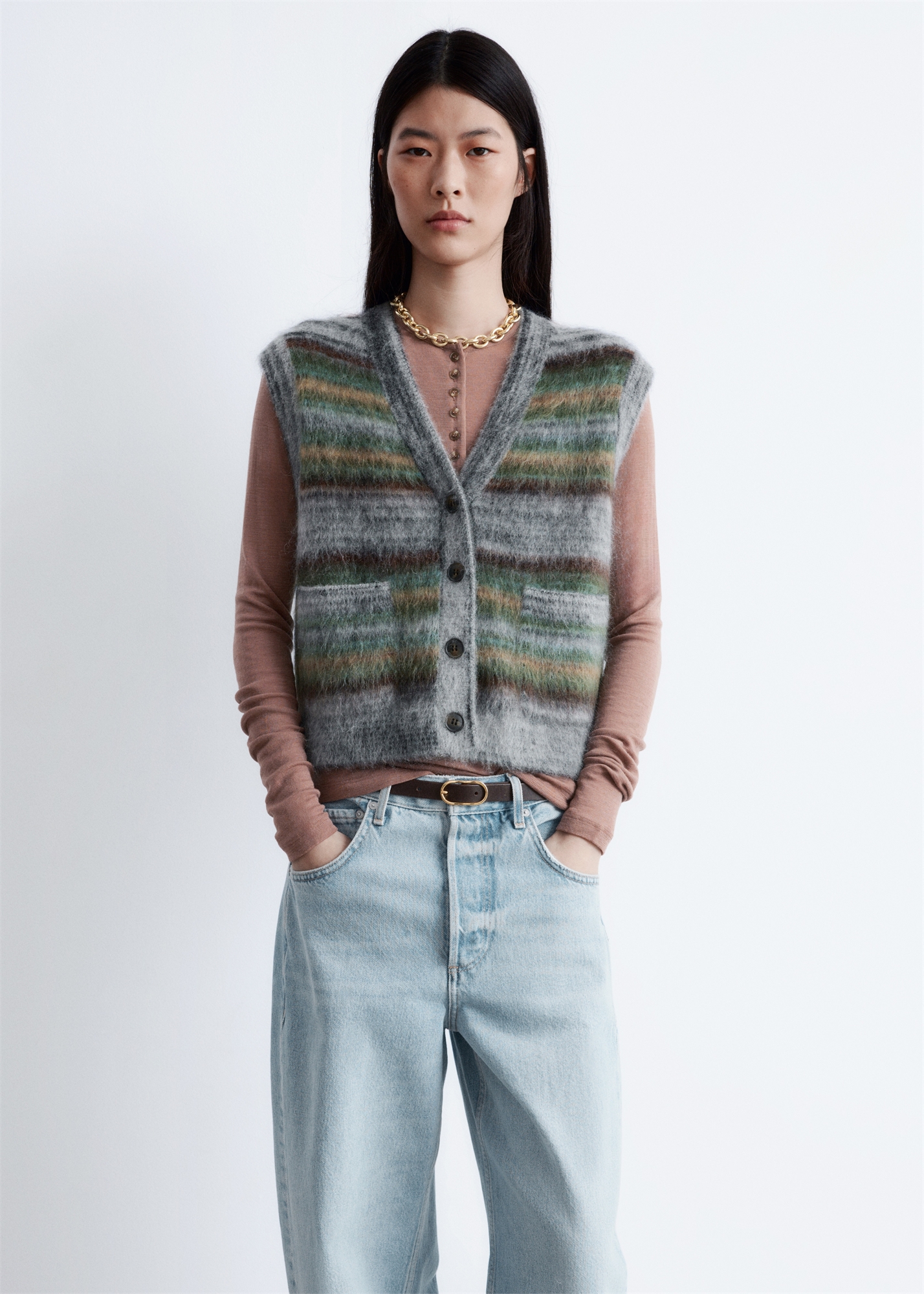 Этот жилет связан из смеси мохера и шерсти с матовым ворсом. Он имеет V-образный вырез, ребристую отделку и два накладных кармана спереди. Застегивается на пуговицы спереди. Надевайте его поверх рубашек и футболок. 32% RMS Мохер TE-00047206 32% RWS Шерсть TE-00047206 Длина жилета: 50 см / 19,7" (размер S)