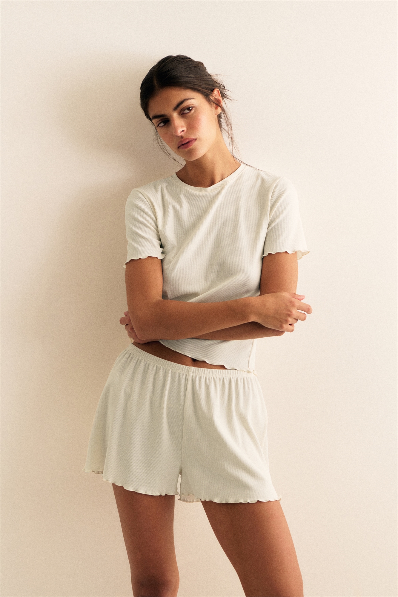 Пижама с футболкой и шортами из мягкой смеси модала и хлопка. Футболка с круглым вырезом, манжеты и подол обработаны оверлоком. Шорты с эластичной резинкой на талии и оверлоком по подолу.