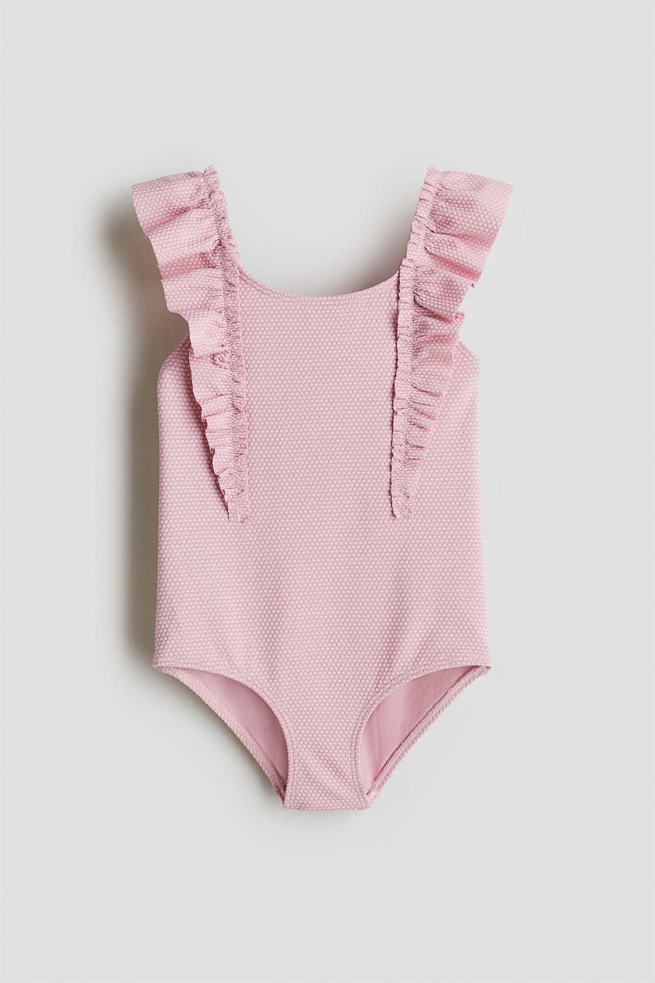 Купальник из фактурного джерси с мерцающими металлическими нитями. Круглый вырез и оборки спереди, переходящие на плечи. На подкладке.