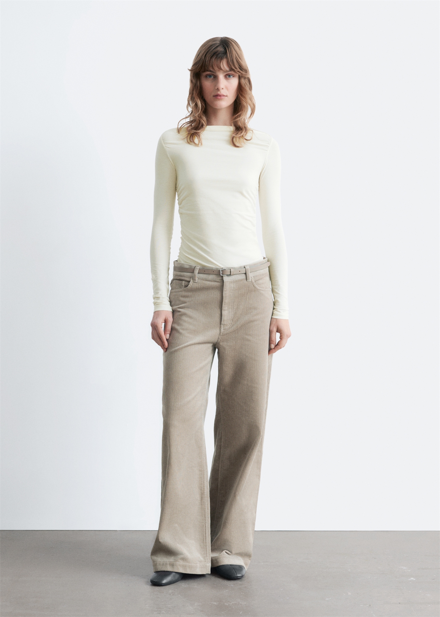 Эти брюки из жесткого вельвета отличаются непринужденным силуэтом с обычной талией, спущенной промежностью и широкими штанинами по всей длине. Застежка на молнию с пуговицей и пятью карманами. Длина штанины: 76 см / 29,8” (EU 36 / UK 8 / US 4)