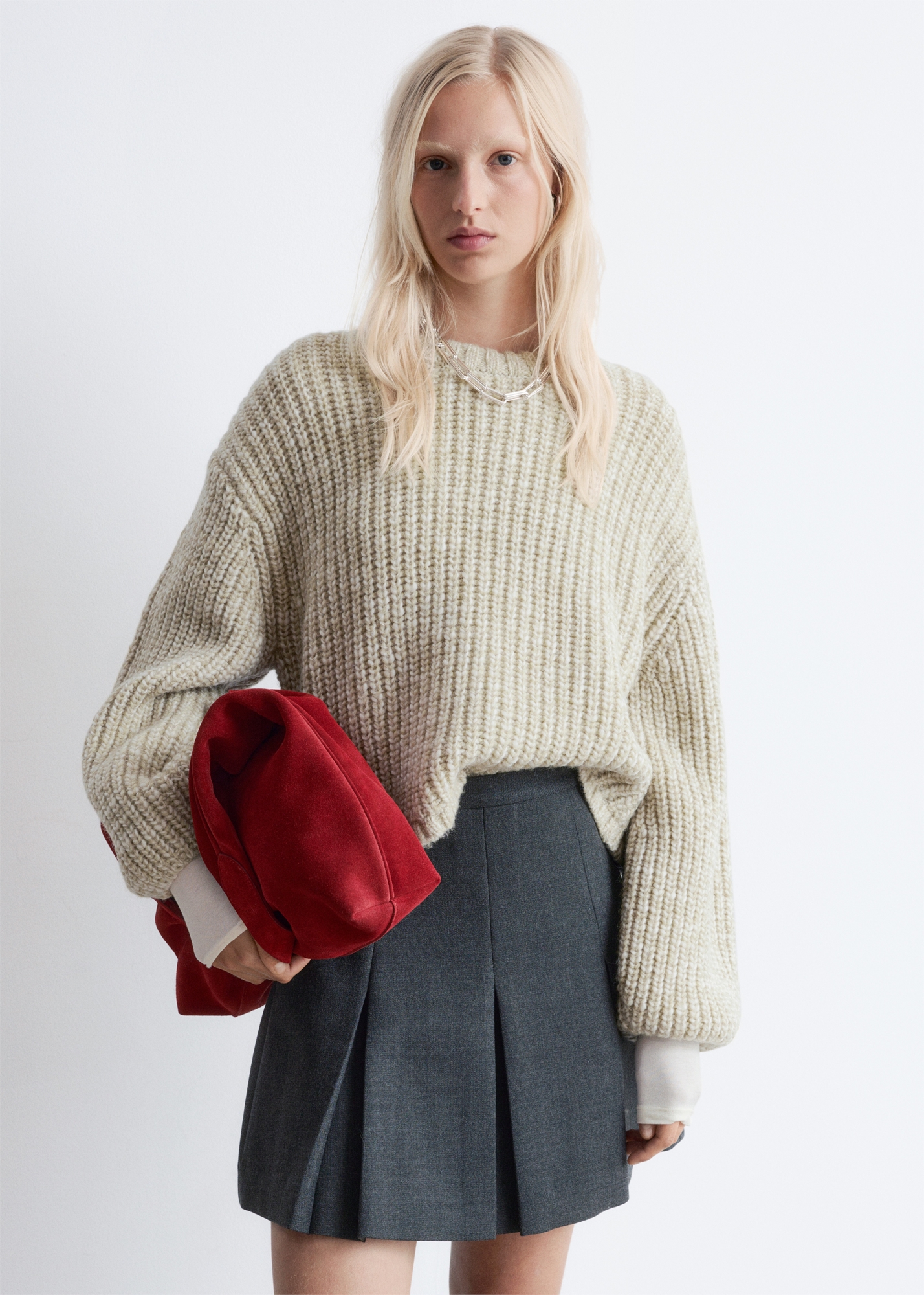 Этот свитер связан из смеси шерсти и альпака, крученой пряжи, создающей мягкую пеструю текстуру. Он выполнен в свободном силуэте "кокон", имеет спущенные плечи и длинные рукава-баллон с эластичными манжетами. 70% шерсть RWS TE-00047206 11% альпака RAS TE-00047206 Длина джемпера: 50 см / 19,7" (размер S)