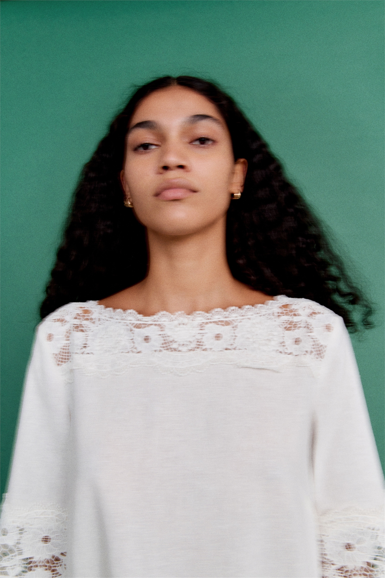 Короткое платье из тканого материала, украшенное кружевом тон в тон. Вырез-лодочка, отверстие для ключа с потайной пуговицей сзади и рукава длиной до локтя. Без подкладки.