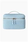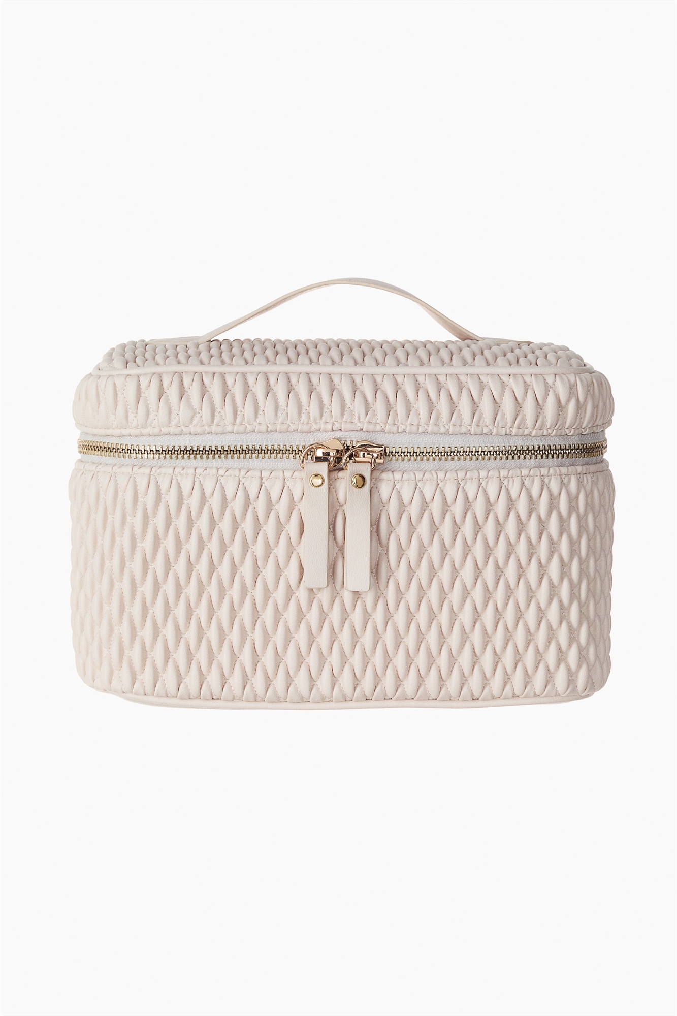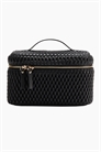 Коробчатая косметичка из ткани с покрытием и стегаными швами с крышкой на молнии и ручкой сверху. Петельки для кистей на внутренней стороне крышки позволяют аккуратно хранить кисти и другие инструменты для макияжа. На подкладке. Глубина 13 см. Высота 13 см. Ширина 21 см.