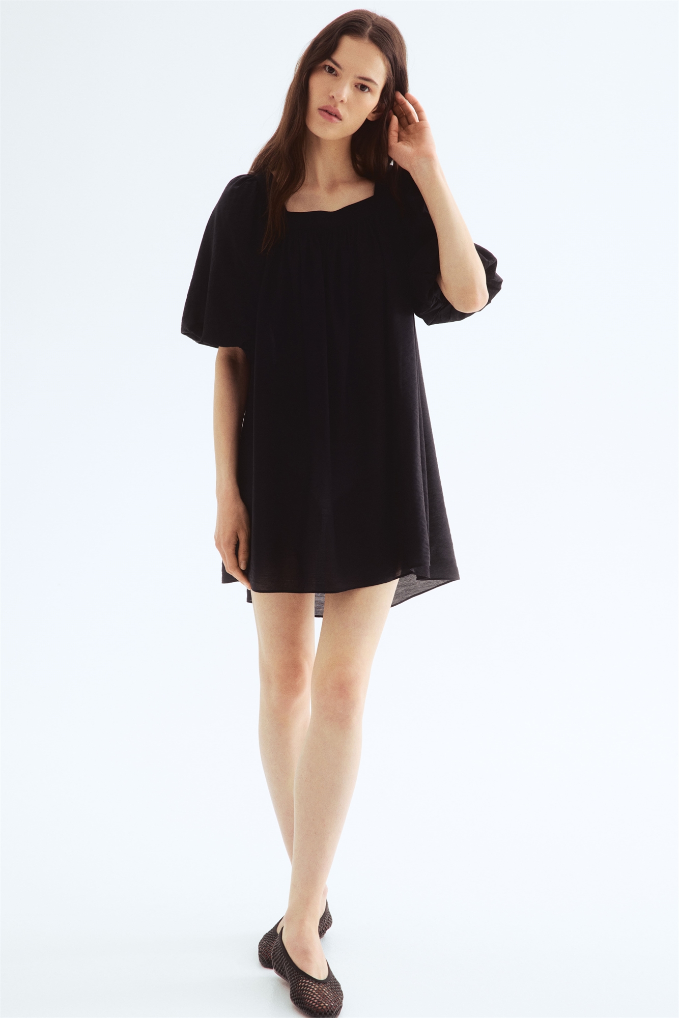 Короткое платье свободного покроя из воздушной ткани с квадратным вырезом с завязками. Рукава-баллоны длиной до локтя покроя реглан с узкими эластичными манжетами. Частично на подкладке.