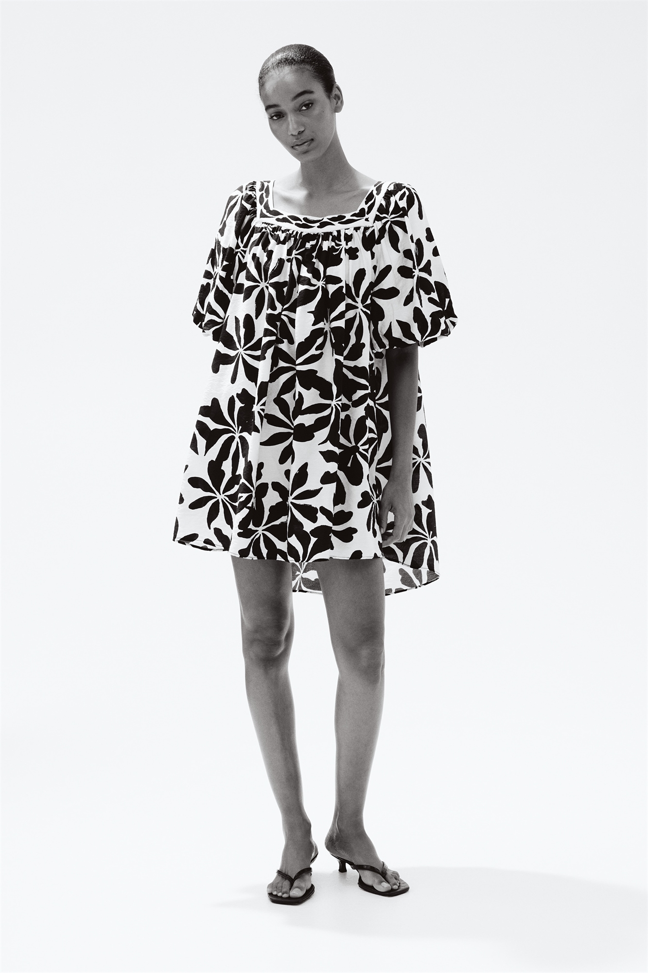 Короткое платье свободного покроя из воздушной ткани с квадратным вырезом с завязками. Рукава-баллоны длиной до локтя покроя реглан с узкими эластичными манжетами. Частично на подкладке.