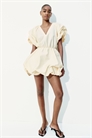 Короткое платье из хлопкового микса с хрустящим переплетением. Глубокий V-образный вырез, короткие рукава реглан, эластичный шов на талии и объемная юбка-баллон. Частично на подкладке.
