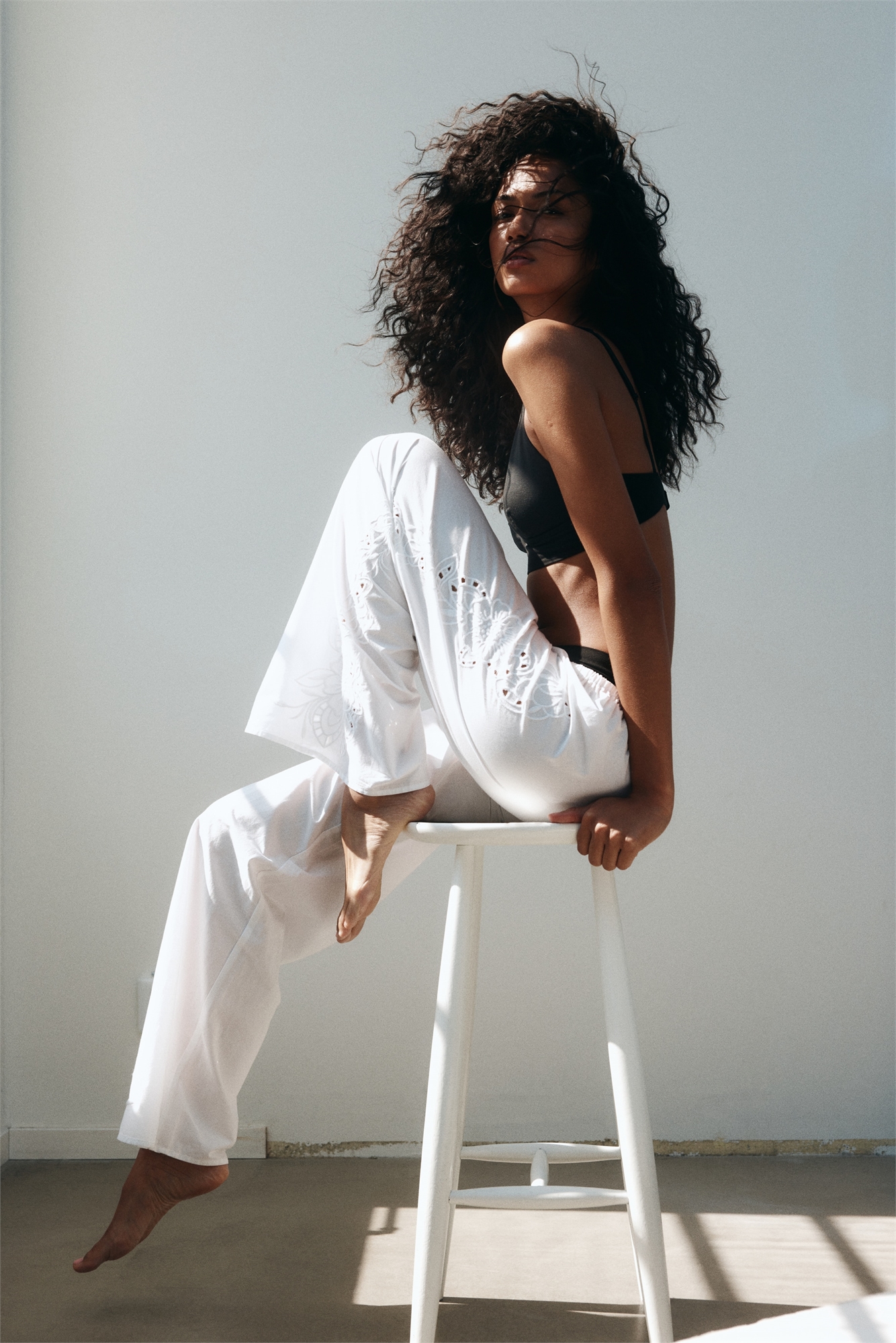 Мягкий бюстгальтер без проводов из хлопкового джерси-стрейч с регулируемыми бретелями и чашечками с джерси-подкладкой, которые придают бюсту естественную форму и обеспечивают легкую поддержку. Широкая окантовка по подолу и застежка на крючки и глазки сзади.