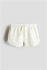 Шорты из легкого толстовочного материала, изготовленного из хлопка. Эластичный пояс с завязками и закругленные края с небольшим разрезом с каждой стороны.