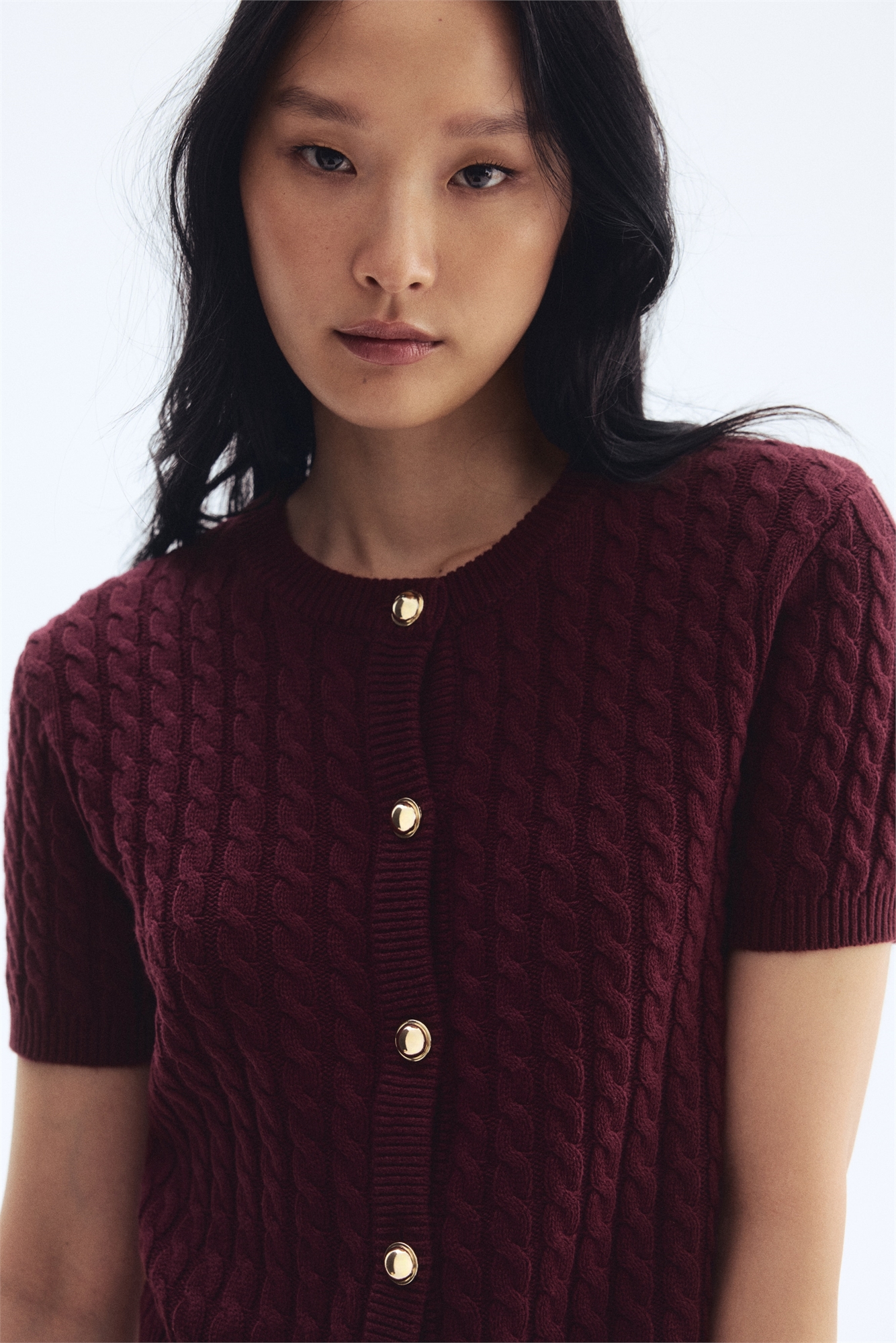 Короткий приталенный кардиган мягкой вязки в рубчик из смеси хлопка. Круглый вырез, металлические пуговицы спереди и короткие рукава. Окантовка вокруг выреза, по краю пуговиц, на манжетах и подоле.