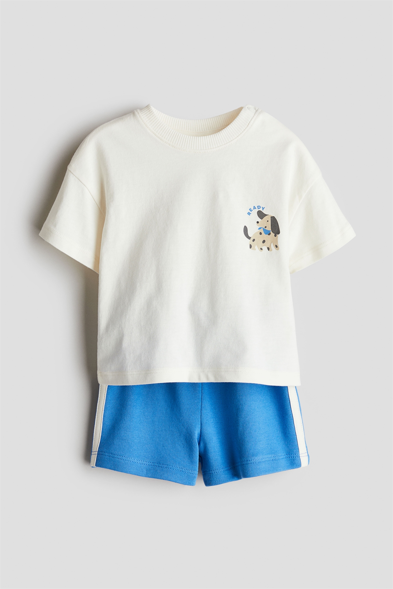 Хлопковый комплект из футболки и шорт. Футболка из мягкого трикотажа с круглым вырезом с ребристой отделкой и застежками с одной стороны (кроме размеров 2-4Y), спущенными плечами и короткими рукавами. Шорты с эластичным утягивающим поясом.