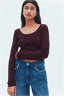 Джемпер из мягкого трикотажа в рубчик с глубоким круглым вырезом и длинными рукавами. Окантовка вокруг выреза, на манжетах и подоле.