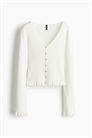 Короткий кардиган с длинными рукавами из мягкого трикотажа в рубчик. Облегающий крой с V-образным вырезом, пуговицы спереди и отделка оборками на манжетах и подоле.