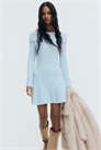 Короткое платье с длинными рукавами из мягкого трикотажа в рубчик с добавлением шерсти. Облегающий лиф с широкой складкой в верхней части и расклешенная юбка.