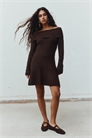 Короткое платье с длинными рукавами из мягкого трикотажа в рубчик с добавлением шерсти. Облегающий лиф с широкой складкой в верхней части и расклешенная юбка.