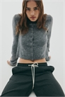 Короткий приталенный кардиган из мягкого тонкого трикотажа с круглым ребристым вырезом, пуговицами спереди и длинными рукавами. Ребристые манжеты и подол.