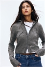 Короткий приталенный кардиган из мягкого кабельного трикотажа с ребристой вязкой на спине. Капюшон с капюшоном, потайная двусторонняя молния спереди и длинные рукава. Манжеты и подол в рубчик.