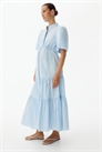 Платье длиной до щиколоток из хлопкового полотна с воротником-бантом и потайными пуговицами спереди. Короткие рукава-баллоны, узкий съемный пояс-завязка под бюстом и расклешенная юбка с ярусами для придания объема.