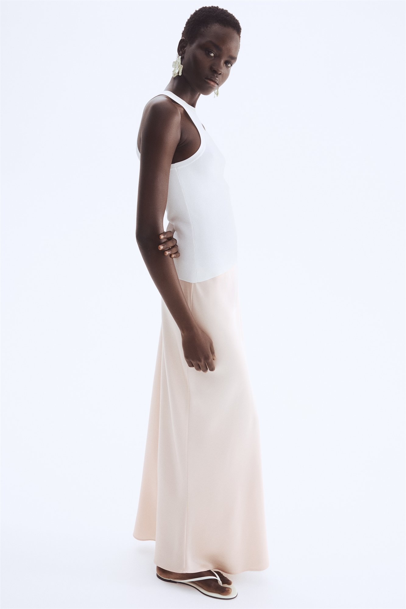 Юбка макси из мягко драпирующегося атласа с высокой талией, скрытой эластичной резинкой и мягким расклешением к подолу. Без подкладки.