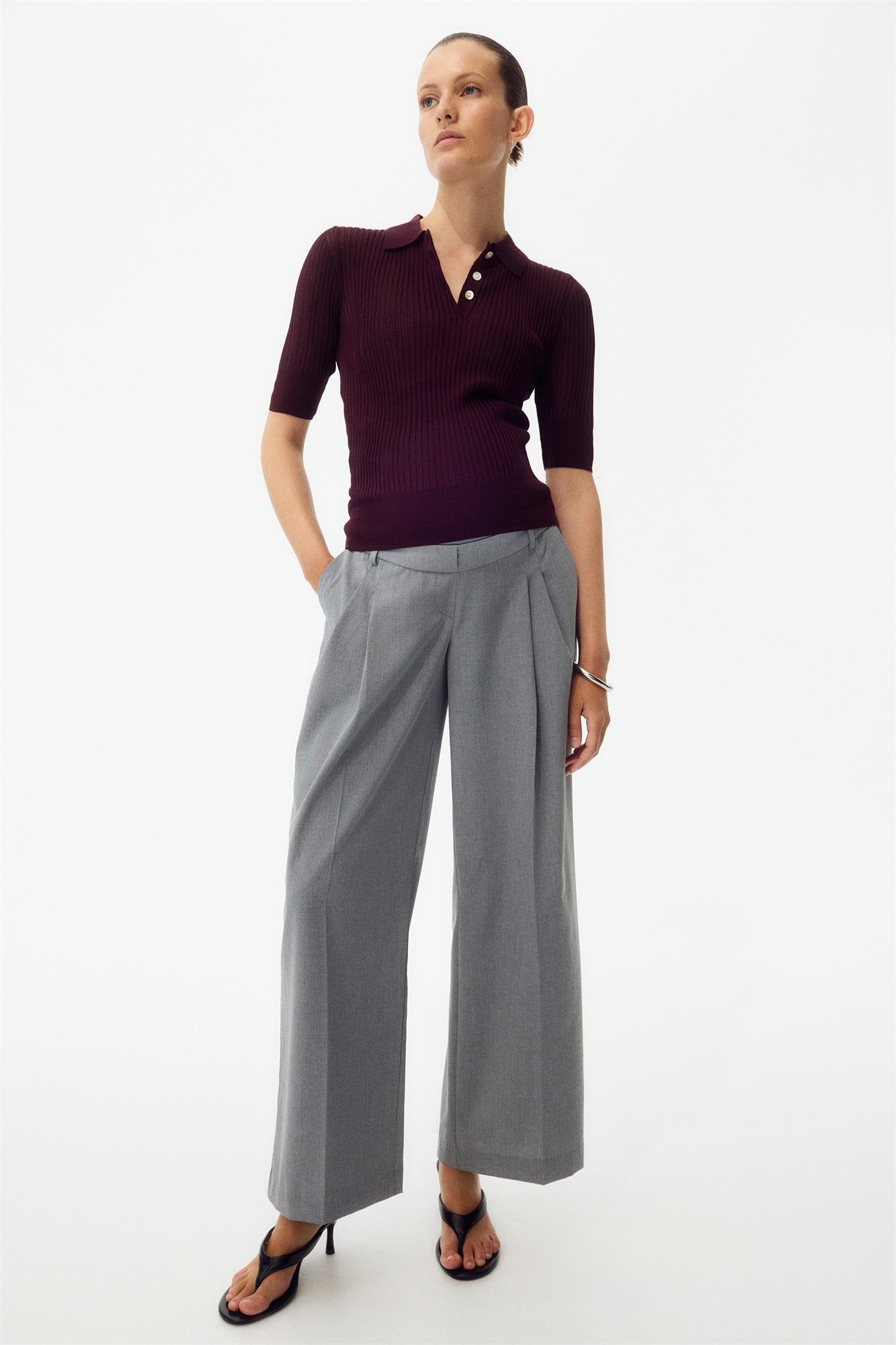 Приталенные брюки с расслабленной посадкой из тканого материала с диагональными боковыми карманами и фальшивыми карманами сзади. Эластичная резинка сзади на талии, фальшивая ширинка и широкая панель из джерси на талии для лучшей посадки на животе. Широкие ноги со складками спереди.