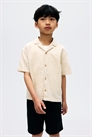 Рубашка с короткими рукавами из смеси льна и хлопка с воздушным плетением. Курортный воротник, слегка спущенные плечи и пуговицы спереди.