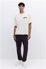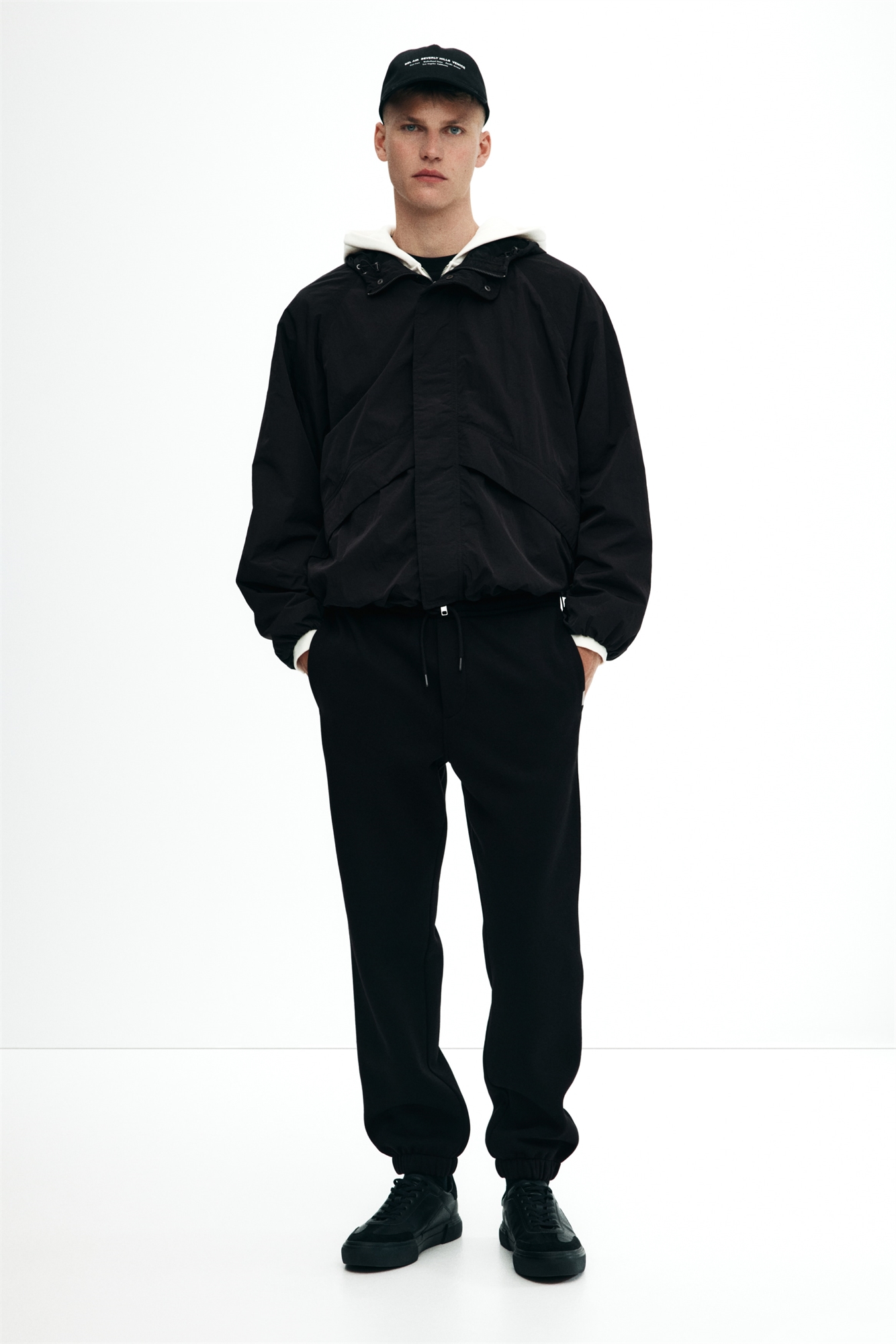 Тренировочные брюки из толстоватой ткани с мягким начесом внутри. Эластичная резинка и потайной шнурок на талии, карманы в боковых швах, открытый задний карман и зауженные ноги с тесемками по краям. Регулярный крой для комфортного ношения и классического силуэта.