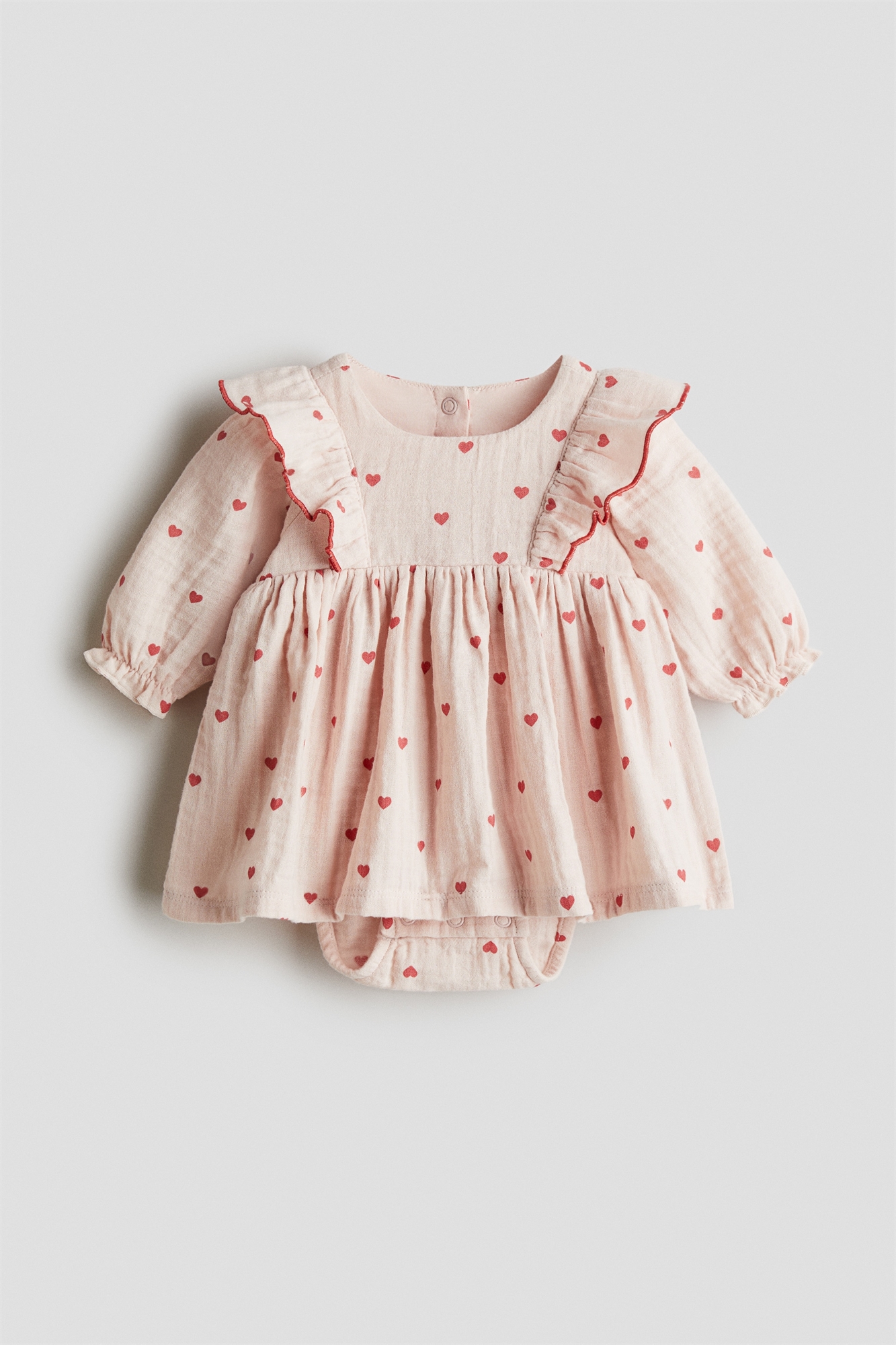 Платье из мягкого хлопкового полотна с вшитым боди и принтом "все в одном". Круглый вырез и оверлочная отделка оборками спереди, которая продолжается на плечах и спине. Застежка на кнопки сзади, длинные рукава с оборчатыми манжетами, сборка на талии и объемная юбка. Боди-комбинезон с застежками внизу для удобства переодевания.