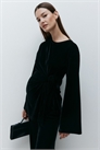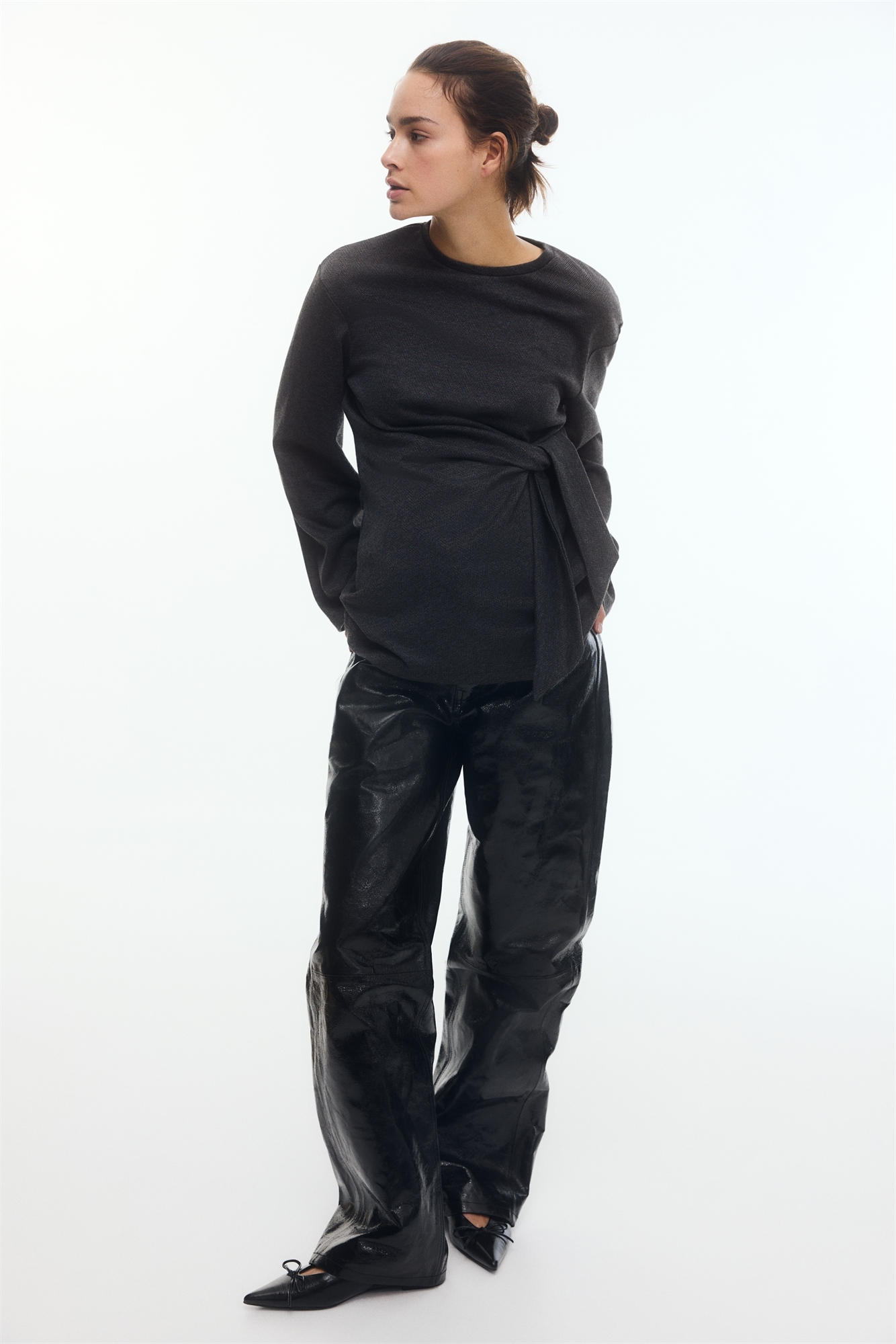 Топ с длинными рукавами, круглым вырезом, спущенными плечами и завязкой на талии с одной стороны.