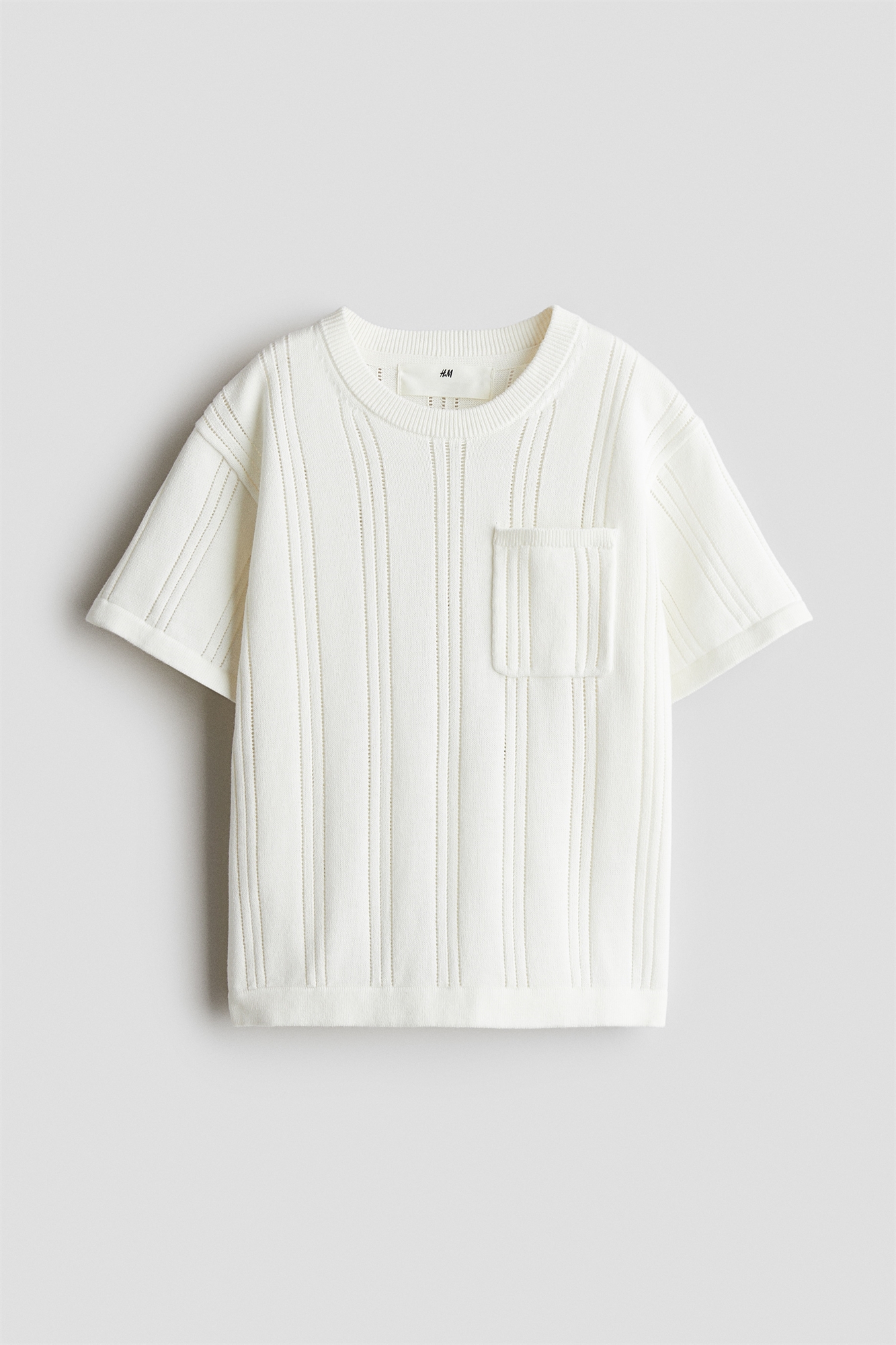 Футболка из мягкого фактурного трикотажного хлопка с круглым вырезом с ребристой отделкой, слегка спущенными плечами и накладным нагрудным карманом.