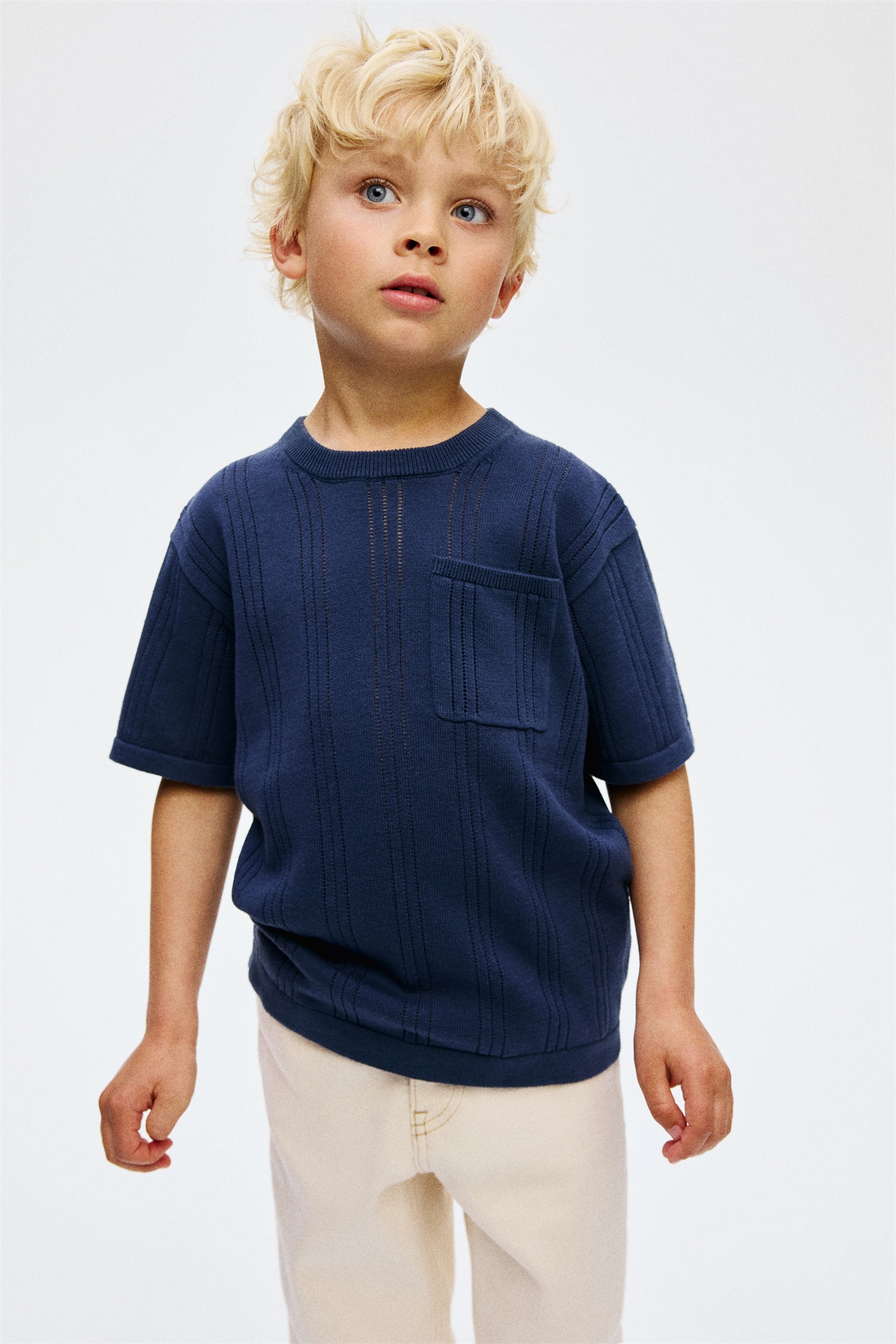Футболка из мягкого фактурного трикотажа с ребристым круглым вырезом, слегка спущенными плечами и накладным нагрудным карманом.