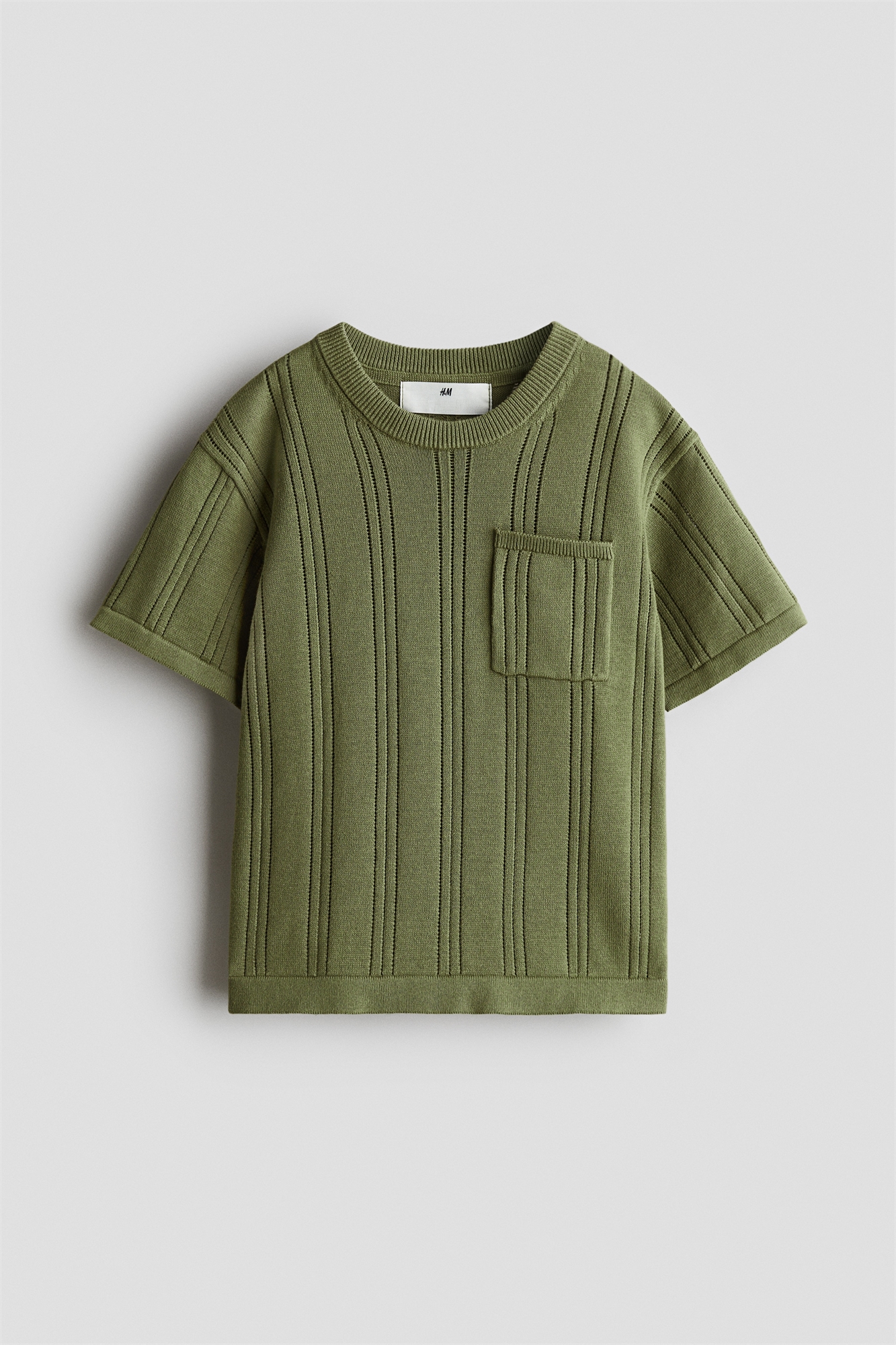Футболка из мягкого фактурного трикотажа с ребристым круглым вырезом, слегка спущенными плечами и накладным нагрудным карманом.