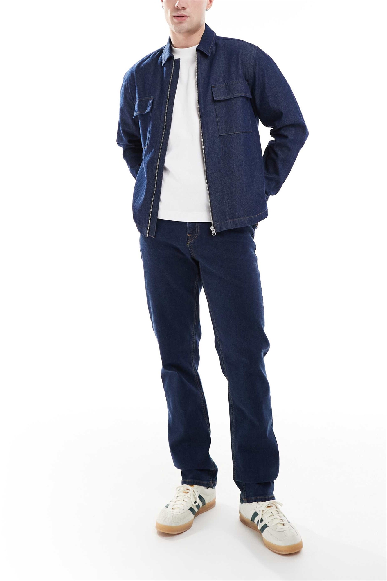 Джинсовая ткань средней плотности: индиговая промывка. Слегка эластичная для небольшой эластичности. Основной материал: 100% хлопок.