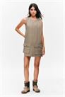 Мини-платье без рукавов в стиле утилитаризма. Изготовленное из хлопкового холста, оно имеет круглый вырез, непринужденный силуэт А-линии и накладные карманы с застежками-кнопками спереди. Спереди - тонкие складки, сзади - невидимая застежка-молния.